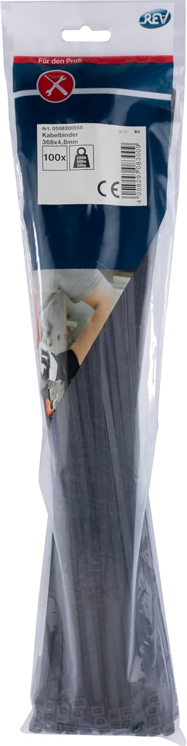 Die REV Kabelbinder 368 × 4,8 mm schwarz, 100 Stück sind eine praktische Lösung, um Kabel sauber und sicher zu fixieren. Wer Wert auf Menge, Zuverlässigkeit und vielseitige Einsatzfähigkeit legt, trifft mit diesem Produkt eine gute Wahl.