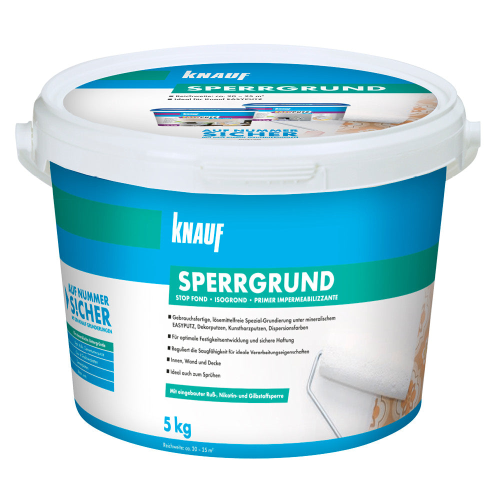 Knauf Sperrgrund ist eine Spezialgrundierung ohne Stützkorn, die vor dem Aufbringen von mineralischen Dekorputzen und anderen dünnen Beschichtungen (z. B. Kunstharz-Putze, Dispersionsfarben, verschiedene Spachteltechniken) angewendet wird. Dieser sogenannte Haftvermittler sorgt dabei für folgende Effekte: 1. optimale Festigkeitsentwicklung, 2. gleichmäßiges Trocknen, 3. sichere Haftung. Knauf Sperrgrund ist optimal abgestimmt auf den Knauf EASYPUTZ Dekorputz. Das besondere Plus: Knauf Sperrgrund wirkt wie eine Fleckensperre. Verfärbungen aus dem Untergrund z. B. von Ruß, Nikotin oder Gilbstoffen können nicht in den Dekorputz eindringen und diesen verfärben.