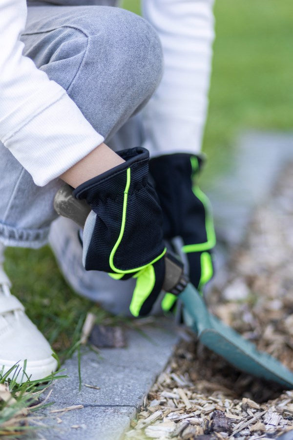 Die PVC-Mininoppen auf der Handfläche sorgen für einen perfekten Griff. Egal ob beim Festhalten von Stiften, kleinen Werkzeugen, Gartengeräten oder beim Klettern und Spielen – mit diesen Handschuhen haben kleine Entdecker alles sicher im Griff.
