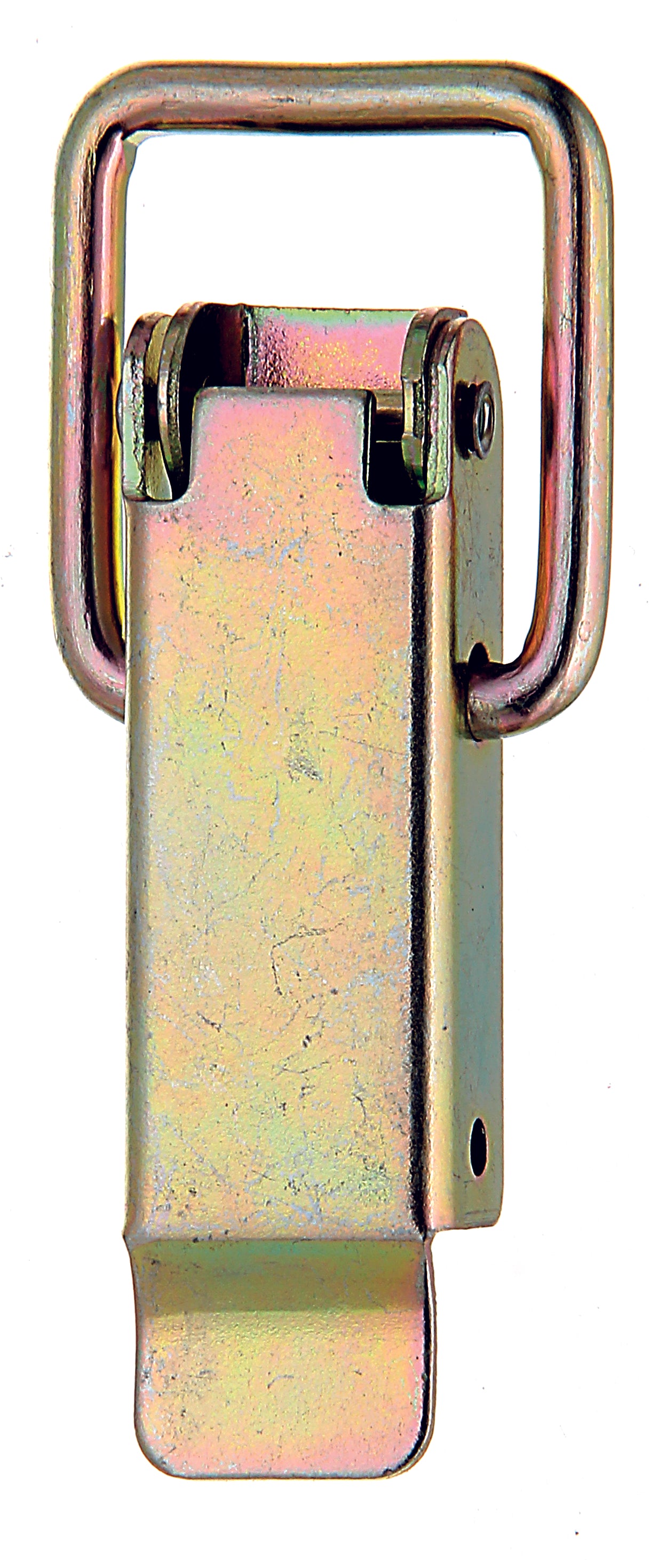 Kistenverschluss ohne Schlossöse und Schließhaken, mit versenkten Schraublöchern, Material: Stahl roh, Oberfläche: galvanisch gelb verzinkt, Höhe: 61 mm, Breite: 18 mm, Schlaufenbreite: 22 mm, für Hakenbreite: 18 mm, Bügel- #: 4 mm, Anzahl Löcher: 2, Loch: #4 mm