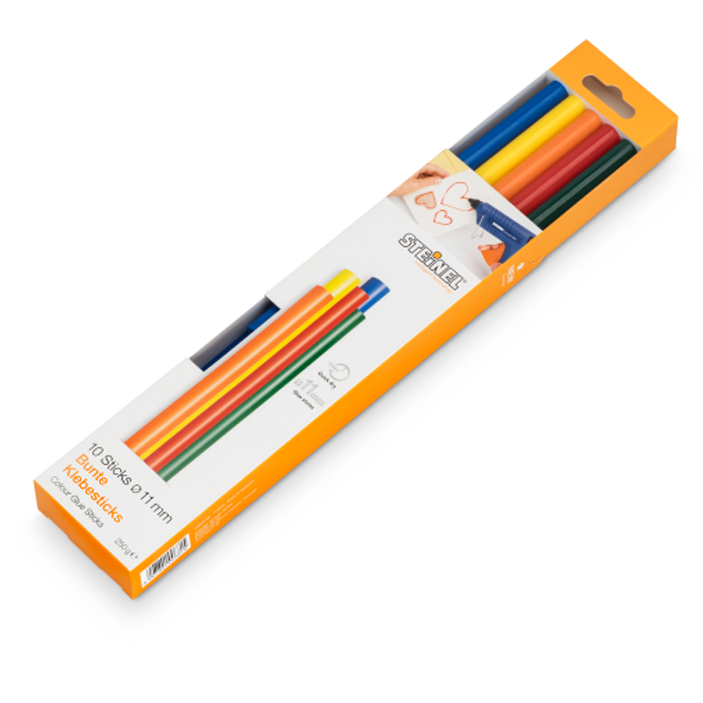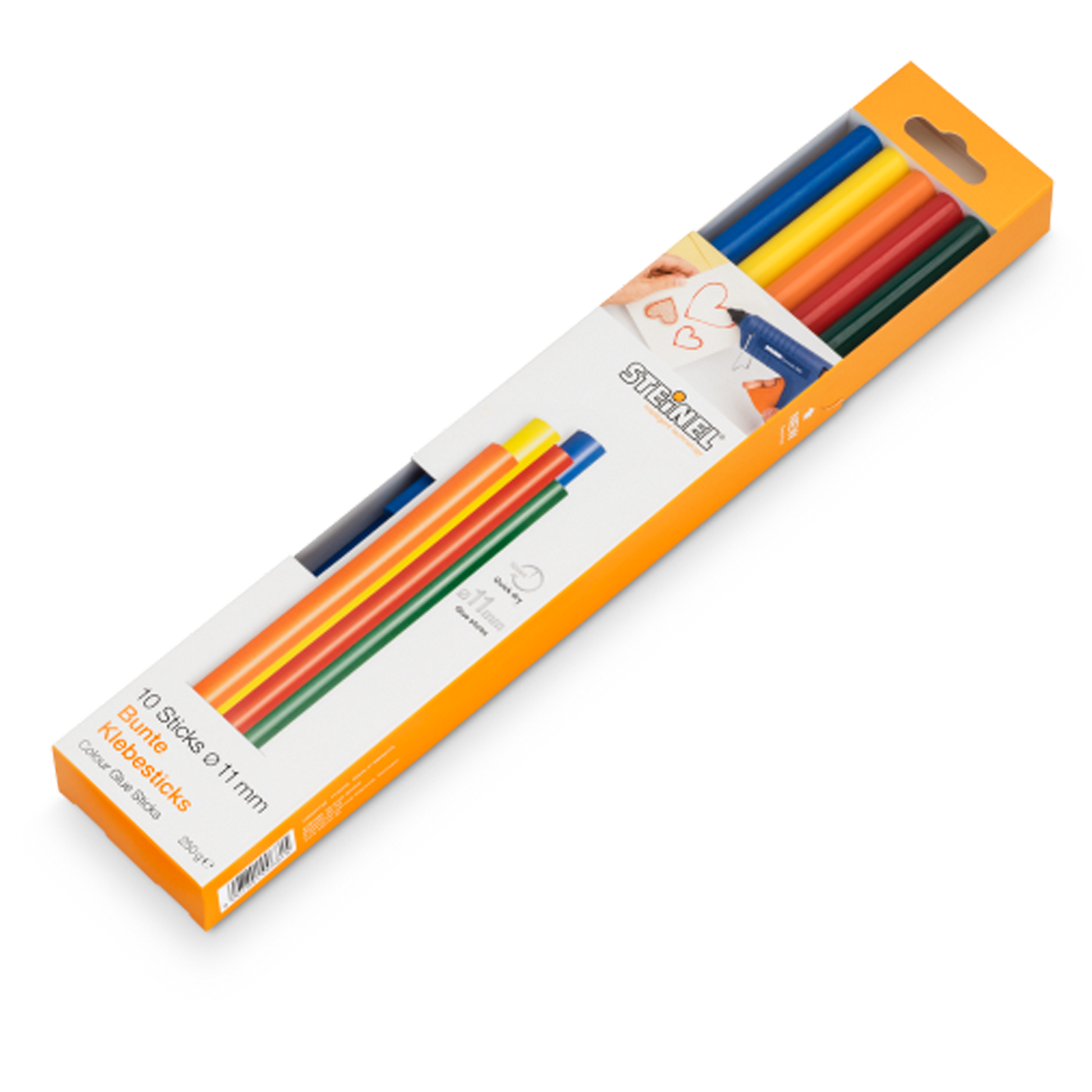 250 g Deko-Kleber. Colour-Sticks Ø 11 mm, qualitativ hochwertiger Schmelzklebestoff, zum Basteln und Dekorieren. In den Farben Gelb (2x), Orange (2x), Rot (2x), Blau (2x) und Grün (2x).