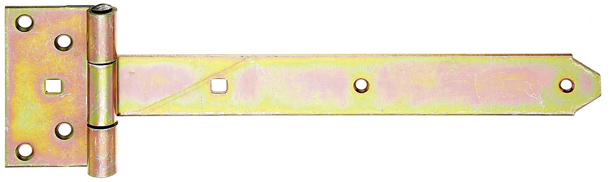 Kreuzgehänge, mit vernietetem Stift, Material: Stahl roh, Oberfläche: galvanisch gelb verzinkt, Bandlänge: 291 mm, Scharnierbreite: 59 mm, Scharnierlänge: 103 mm, Bandbreite: 40 mm, Ausführung: schwer, Materialstärke: 3,50 mm, Anzahl Löcher: 6 / 2, Loch: #6,5 / 9 x 9 mm