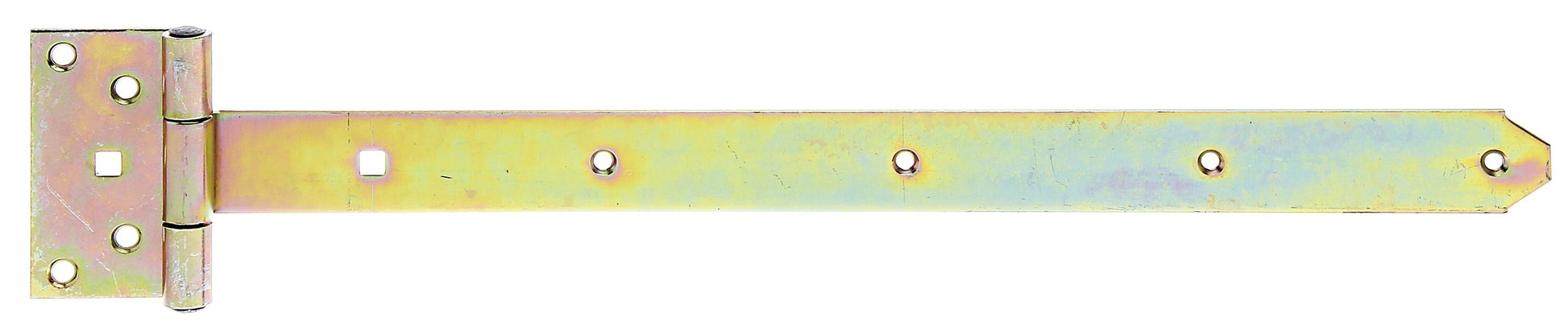 Kreuzgehänge, mit vernietetem Stift, Material: Stahl roh, Oberfläche: galvanisch gelb verzinkt, Bandlänge: 491 mm, Scharnierbreite: 59 mm, Scharnierlänge: 103 mm, Bandbreite: 40 mm, Ausführung: schwer, Materialstärke: 3,50 mm, Anzahl Löcher: 8 / 2, Loch: #6,5 / 9 x 9 mm