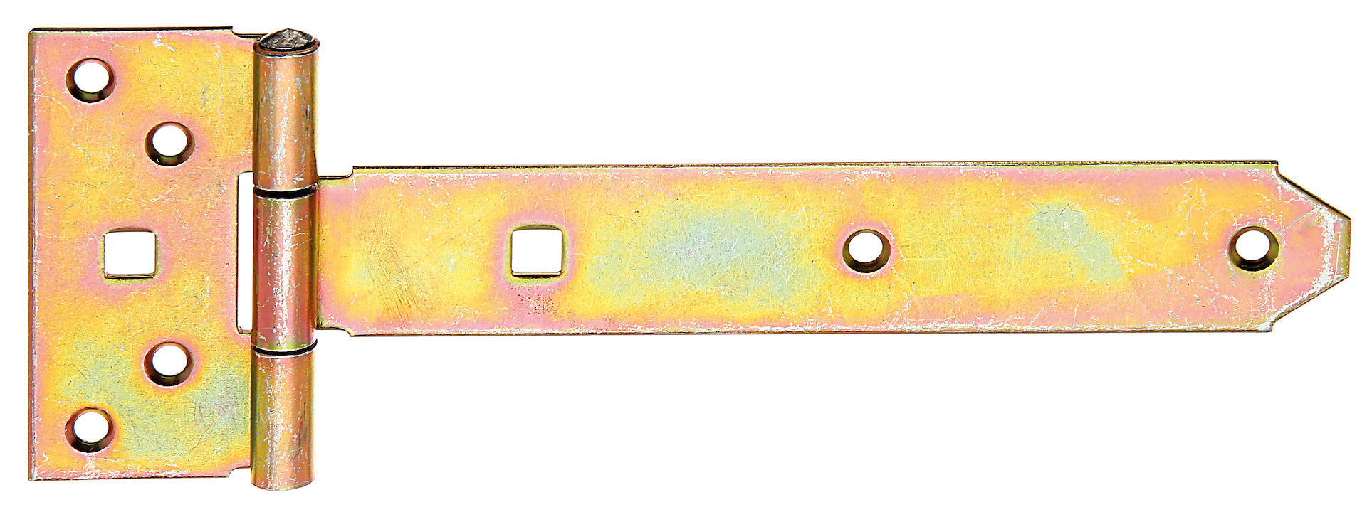 Kreuzgehänge, mit vernietetem Stift, Material: Stahl roh, Oberfläche: galvanisch gelb verzinkt, Bandlänge: 192 mm, Scharnierbreite: 45 mm, Scharnierlänge: 90 mm, Bandbreite: 34 mm, Ausführung: leicht, Materialstärke: 2,00 mm, Anzahl Löcher: 6 / 2, Loch: #6,5 / 9 x 9 mm