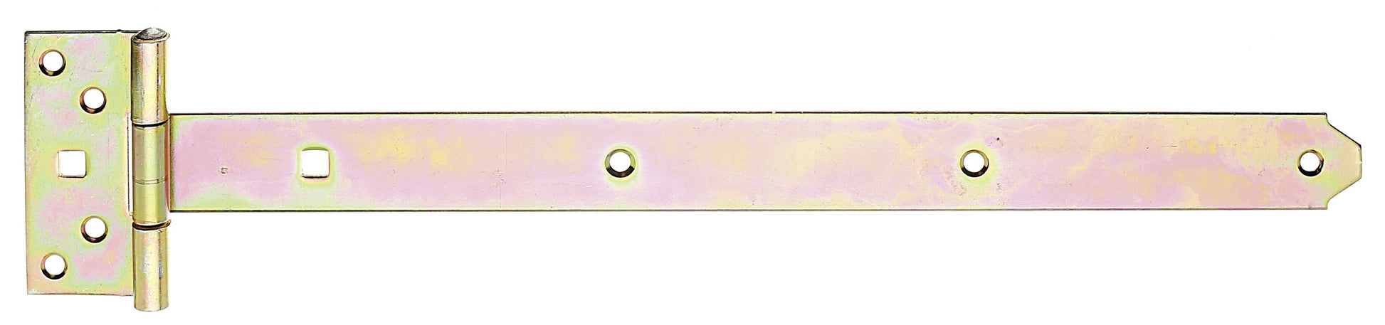 Kreuzgehänge, mit vernietetem Stift, Material: Stahl roh, Oberfläche: galvanisch gelb verzinkt, Bandlänge: 292,5 mm, Scharnierbreite: 45 mm, Scharnierlänge: 90 mm, Bandbreite: 34 mm, Ausführung: leicht, Materialstärke: 2,30 mm, Anzahl Löcher: 7 / 2, Loch: #6,5 / 9 x 9 mm