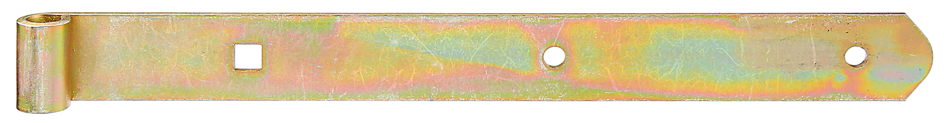 Ladenband, gerade, Abschluss abgerundet, Material: Stahl roh, Oberfläche: galvanisch gelb verzinkt, Länge: 300 mm, Rollen-#: 10 mm, Breite: 30 mm, Materialstärke: 3,00 mm, Anzahl Löcher: 2 / 1, Loch: #7 / 9 x 9 mm