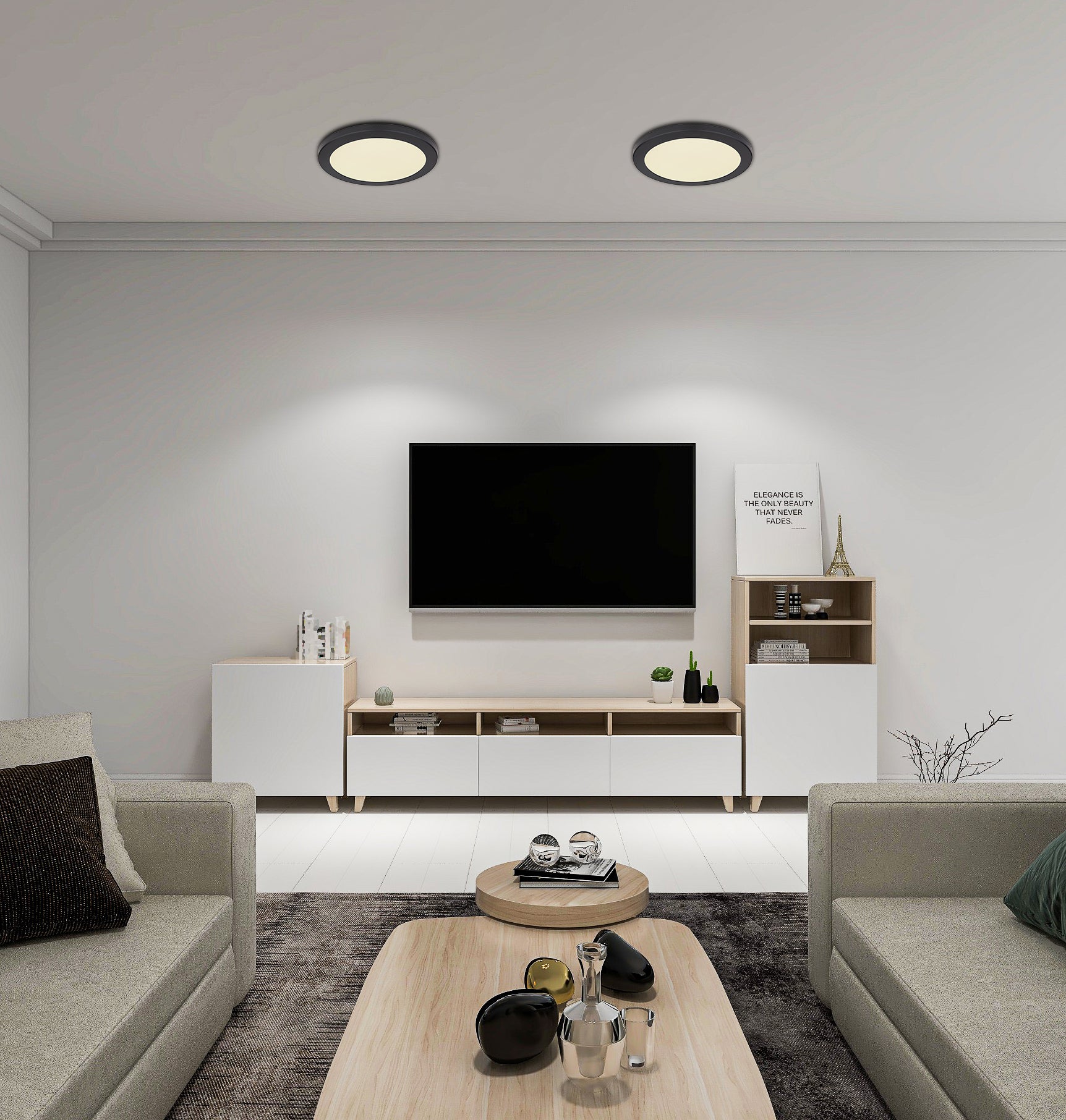 Wer nach einer erstklassigen und schlichten Deckenleuchte sucht, der wird bei dieser schwarze LED Lampe fündig. Ihre Optik ist dezent und schlicht und kann somit jene Raum in ihrem Eigenheim richtig in Szene setzen. Die Leuchte hat einen Durchmesser von 29,8cm und besitzt ein integriertes 24 Watt LED-Leuchtmittel. Die LED-Deckenleuchte leistet insgesamt 1900 Lumen starkes Licht. Außerdem lässt sich die Lichtfarbe in drei Stufen je nach Belieben fixieren. (Warmweiß 3000K – Neutralweiß 4000K – Kaltweiß 6500K). Dank des geringen Stromverbrauchs, ist diese LED Lampe energiesparend und somit auch sehr umweltfreundlich.