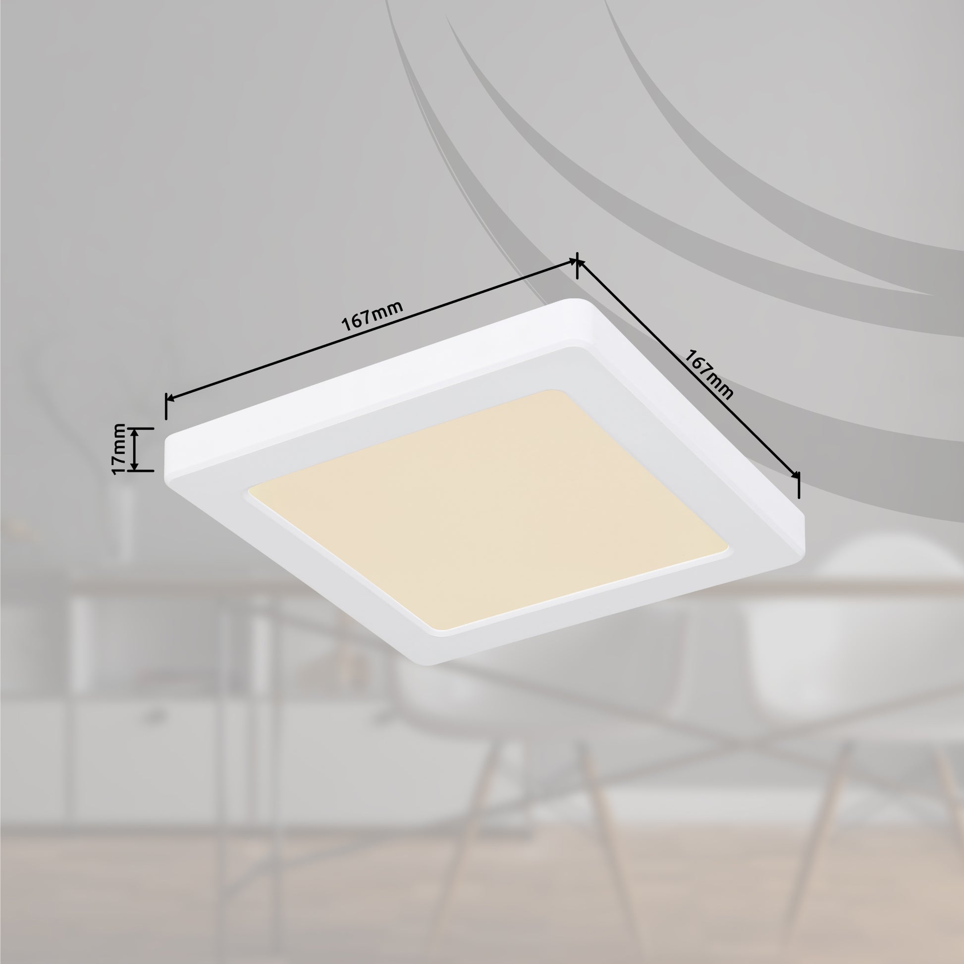 Diese quadratische Deckenleuchte in Weiß der Serie Lasse begeistert durch Ihr tolles Design. In einem weißen Rahmen mit einer Seitenlänge von ca. 16cm befindet sich eine LED-Platine. Diese kann in den Lichtstufen 3000 Kelvin warmweiß, 4500 Kelvin neutral und 6000 Kelvin kaltweiß fixiert werden und erschafft eine angenehme Atmosphäre.
