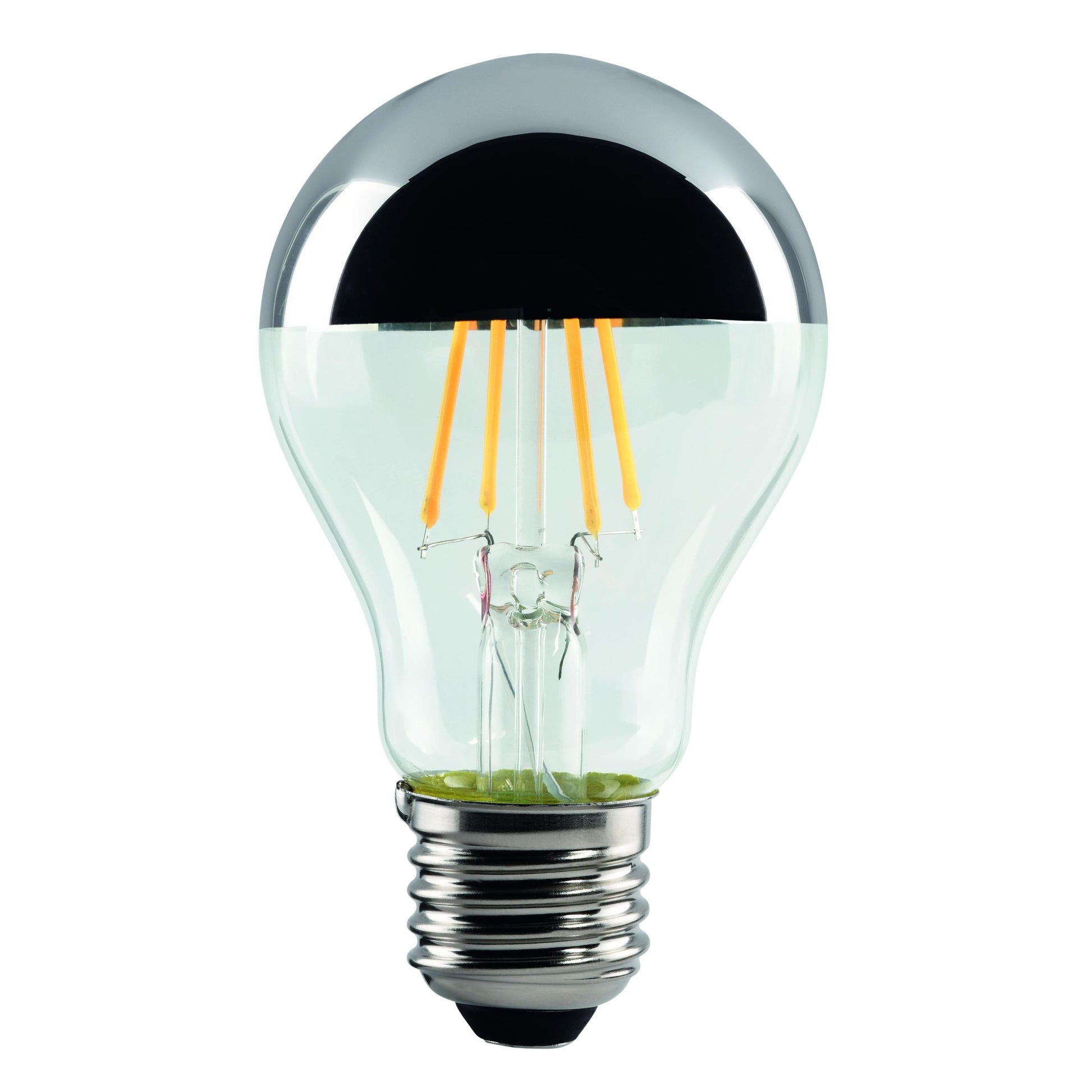 - dekorative Glühlampenform mit Vollglasgehäuse und silbener Kopfverspiegelung