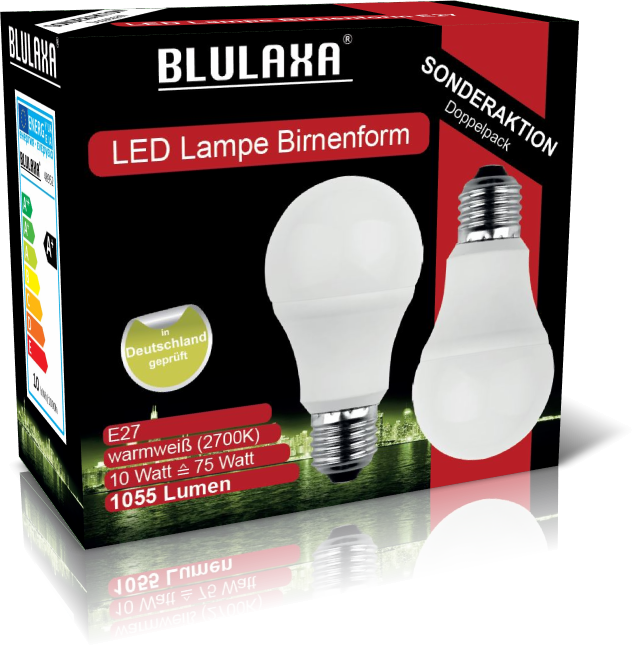 Einer unserer absoluten Bestseller ist die LED Lampe Birnenform 10 Watt aus unserer BLULAXA® Serie. Als kleines Highlight haben wir uns entschlossen die LED Lampe Birnenform 10 Watt warmweiß als Promotion im Doppelpack kostengünstig anzubieten. Das warmweiße Licht des Leuchtmittels verteilt sich gleichmäßig über die Oberfläche der opalen Kunststoffabdeckung und sorgt für eine homogene Ausleuchtung. Dank handelsüblichem E27 Sockel ist das LED-betriebene Leuchtmittel überall dort einsetzbar, wo eine passende Fassung vorhanden ist.