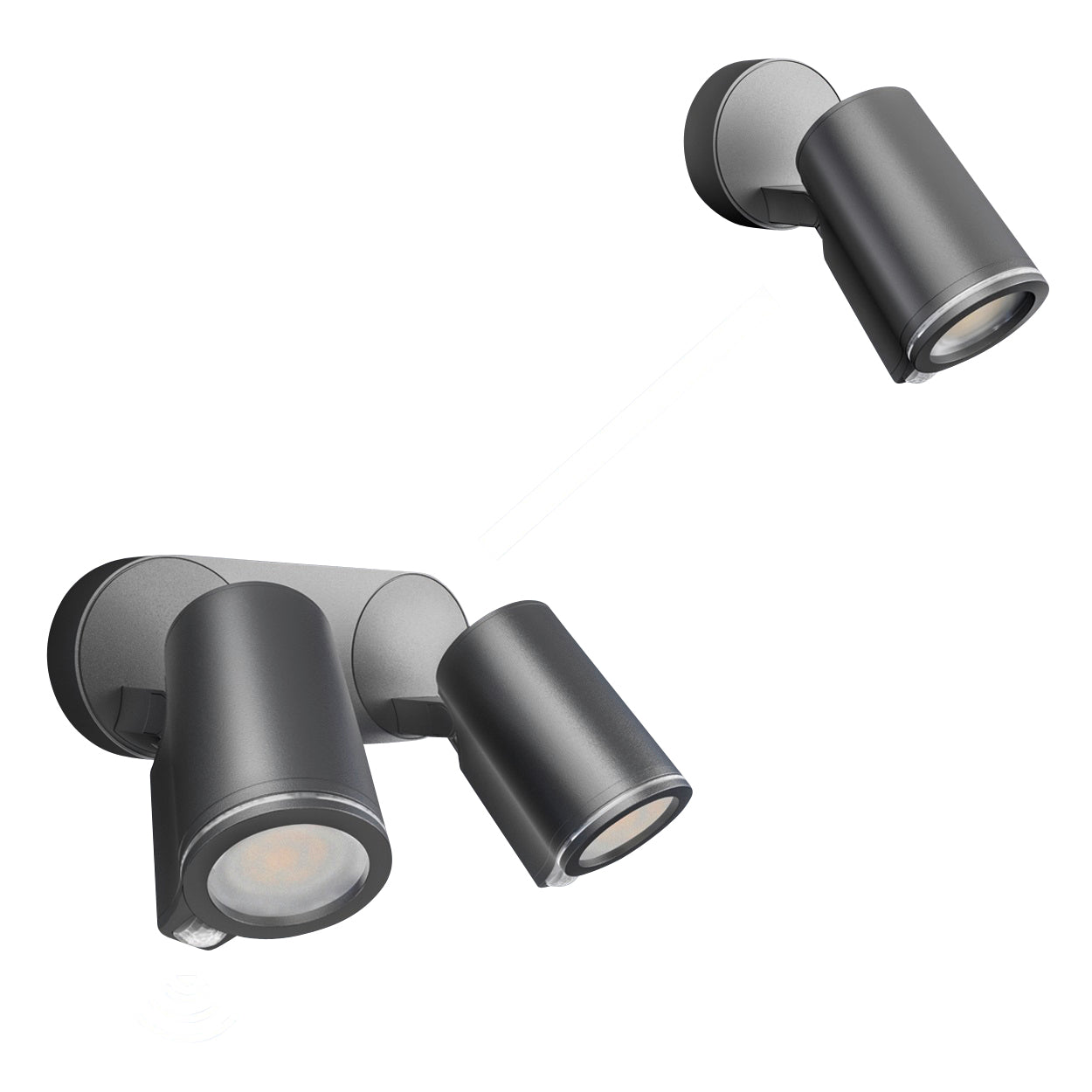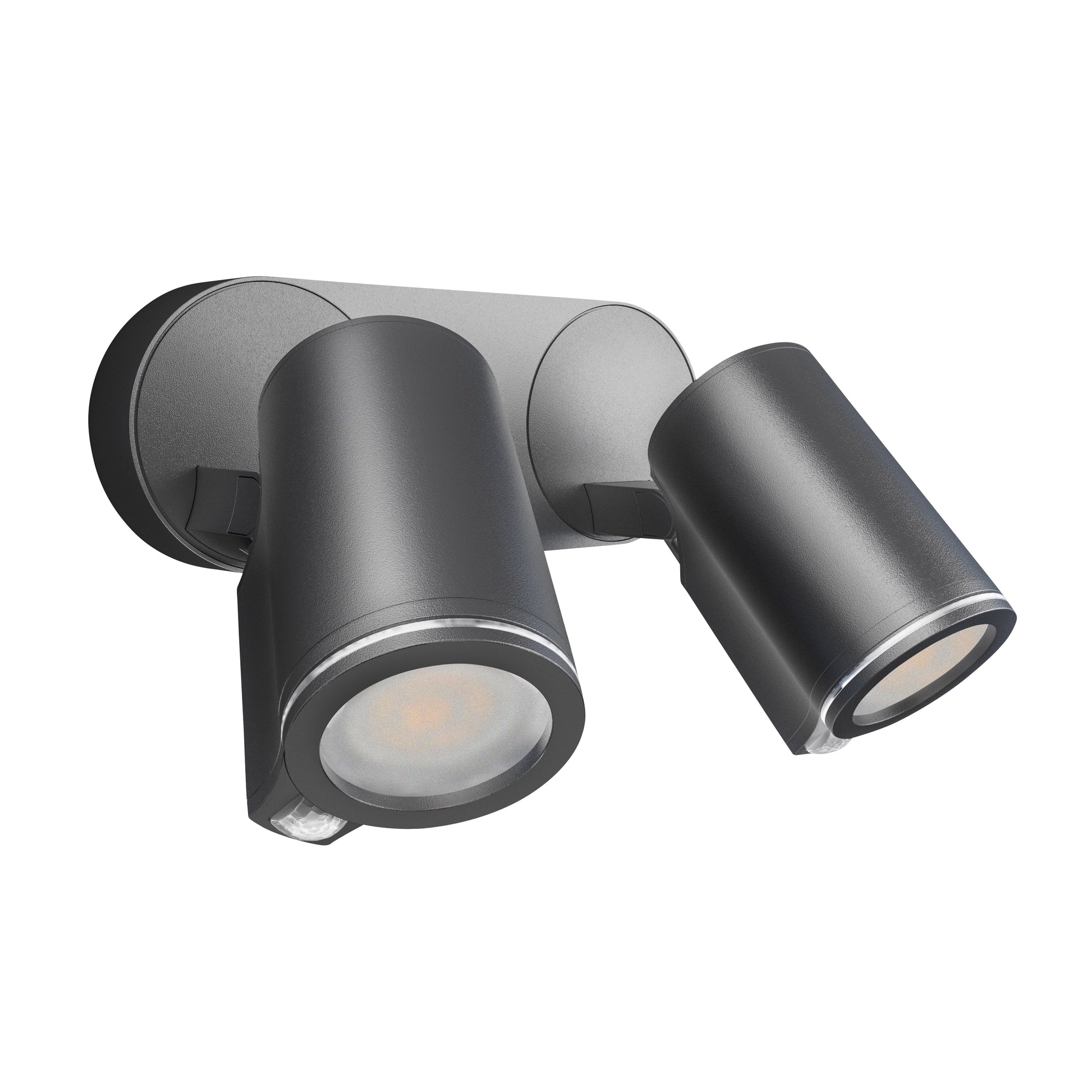 Leuchtstarkes LED-Doppel. Wandspot DUO Sensor mit zwei schwenkbaren Strahlerköpfen (180° horizontal, 90° vertikal) mit je 90° Infrarot-Sensor (10 m Reichweite). 2x 520 lm bei 2x 7W für optimale Ausleuchtung rund ums Haus. Mit Zeiteinstellung (8 s - 35 min) und Dämmerungseinstellung (2-1000 Lux). Mehrere Spots per Kabel vernetzbar. 2x GU-10-LED Leuchtmittel inklusive.