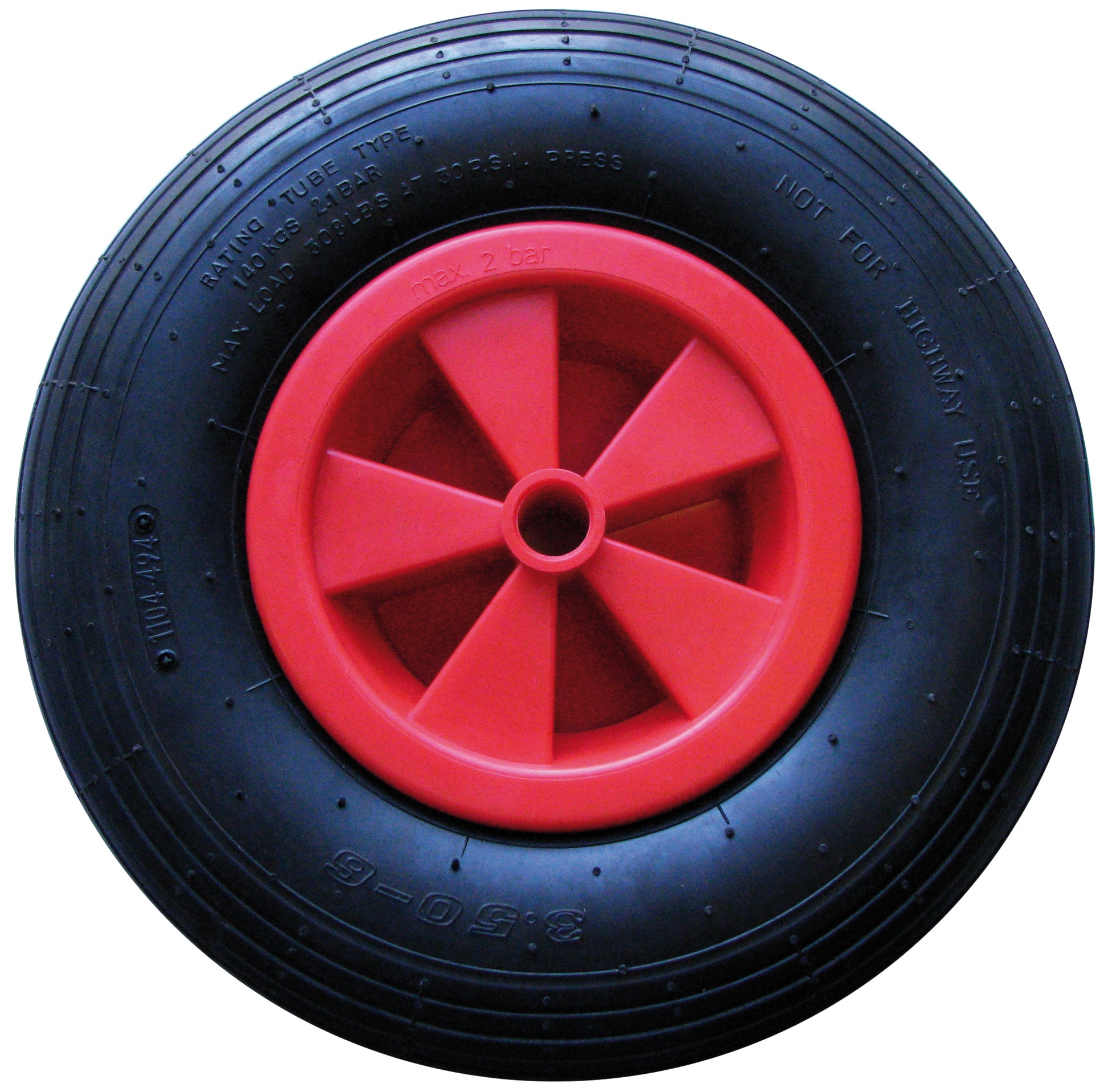 Felge aus Kunststoff mit Gleitlager. Reifen mit Rillenprofil, 4 Gewebeeinlagen (Ply-Rating) mit Schlauch.