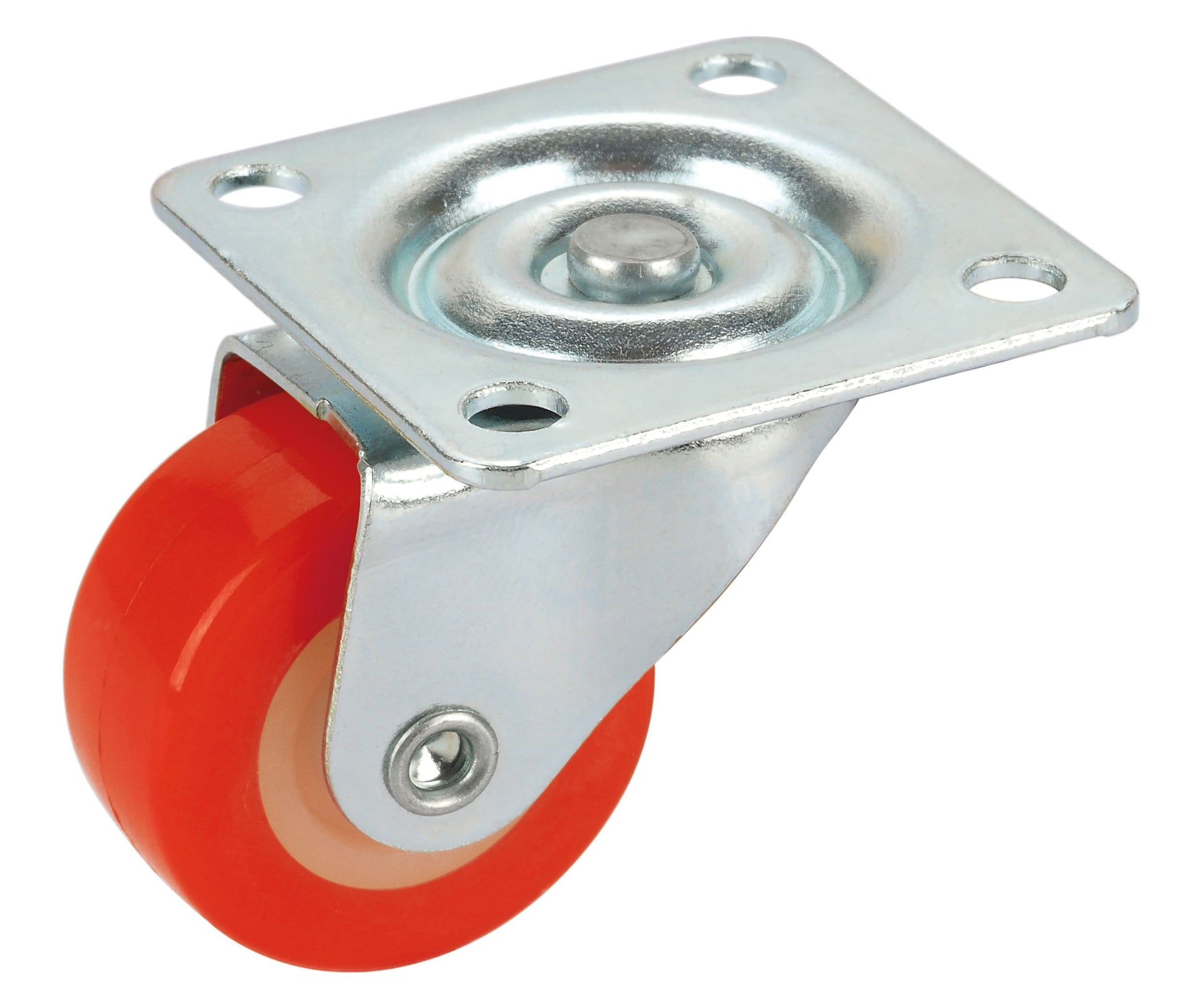 Gehäuse aus verzinktem Stahlblech, einfaches Kugellager im Drehkranz; Rad mit Kunststofffelge und roter Polyurethan-Lauffläche, Gleitlager