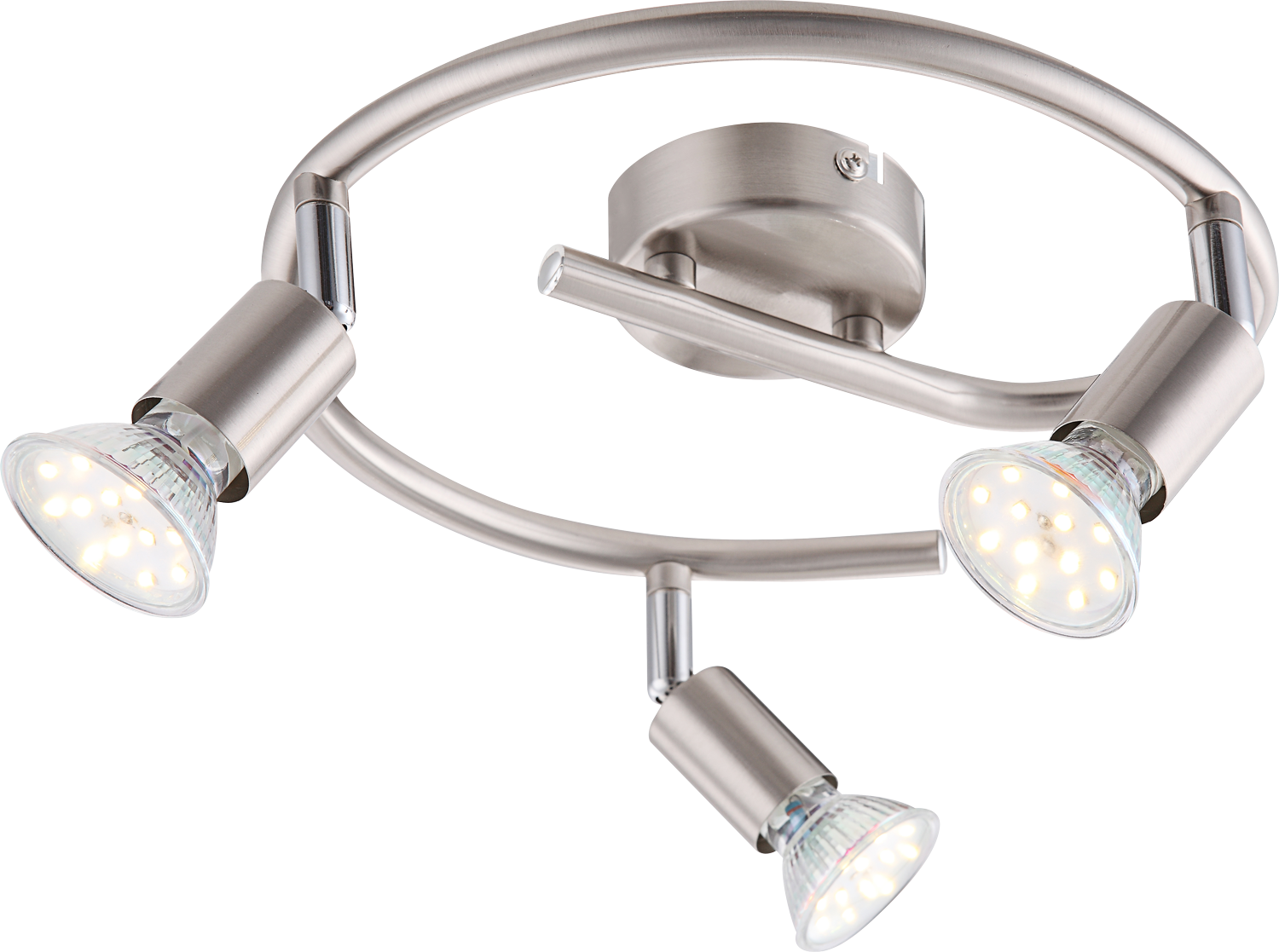 Auch dieser Strahler aus der Serie Matrix wirkt durch sein Design zeitlos und vielseitig einsetzbar. Alle Bestandteile dieser Lampe sind verchromt und nickel matt. Der Strahler hat einen Durchmesser von 25 cm und wirkt durch die e-Form verspielt. Die ganze Lampe besteht aus insgesamt drei Strahlern die durch die LED Leuchtmittel mit GU10 Fassung 750 Lumen starkes und 3000K warmweiße Licht ausstrahlen, welches sich sehr gut mit den anderen Bestandteilen der Lampe ausgleicht.