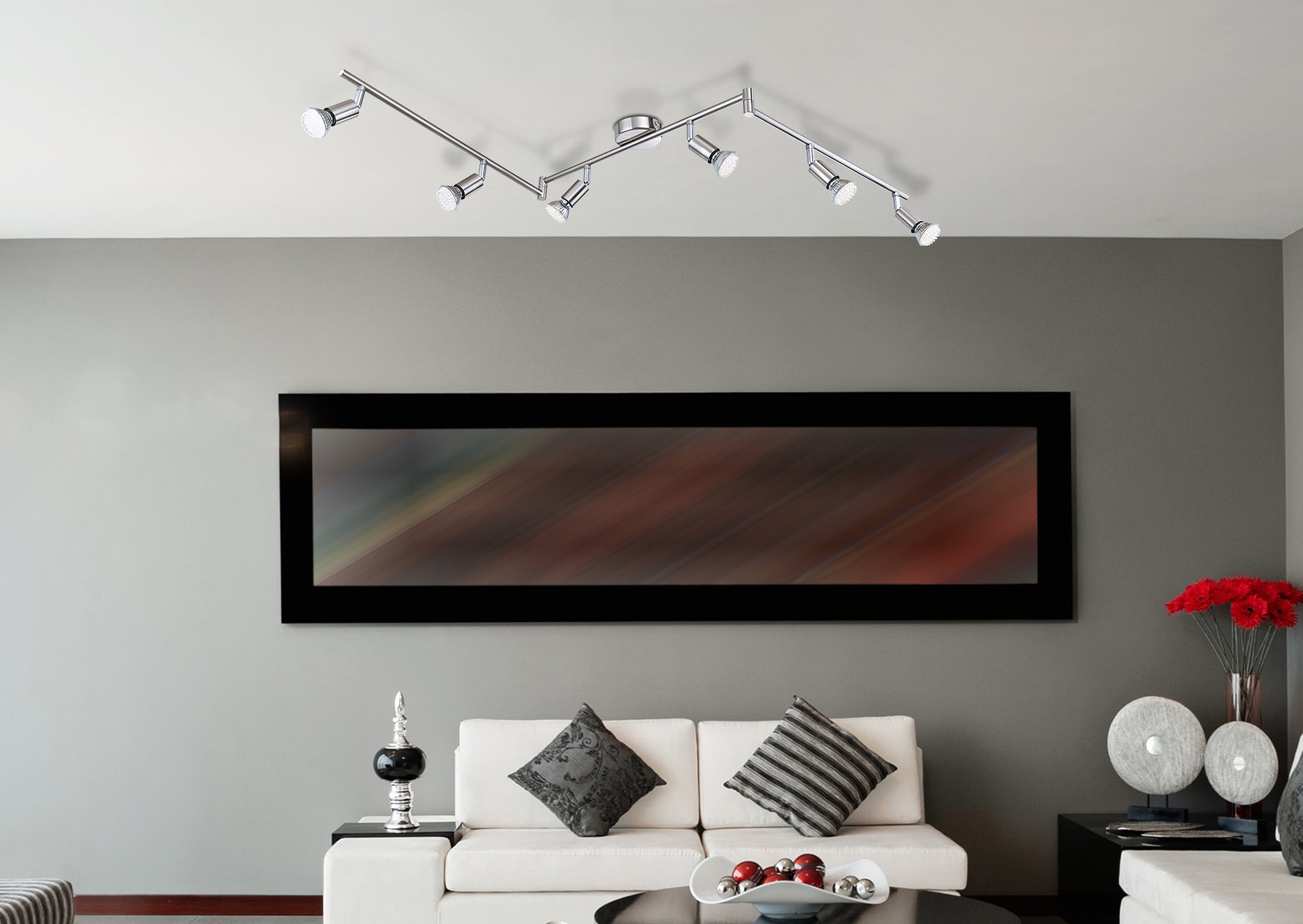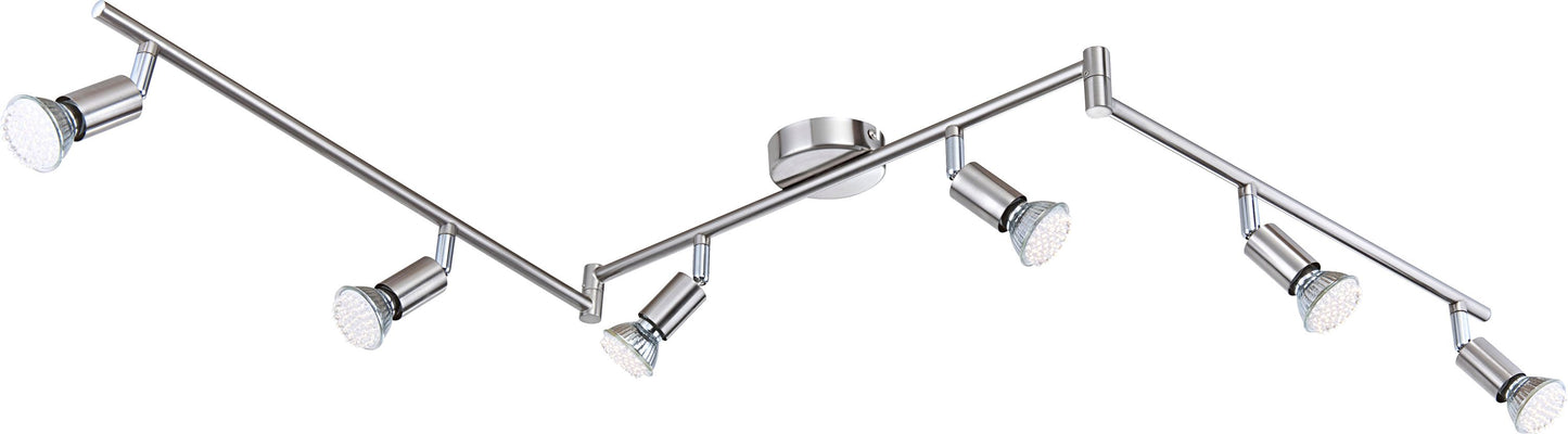 Die größte Lampe der Serie Matrix wirkt durch ihr Design zeitlos und vielseitig einsetzbar. Alle Bestandteile dieser Lampe sind verchromt und nickel matt. Der Strahler hat eine Länge von 145 cm und besteht aus drei verbunden Stangen wovon die äußersten beweglich sind. An der ganzen Lampe sind insgesamt sechs Strahler angebracht welche ein 1500 Lumen starkes und 3000K warmweißes Licht spenden, welches sich sehr gut mit den Rest der Lampe fügt.