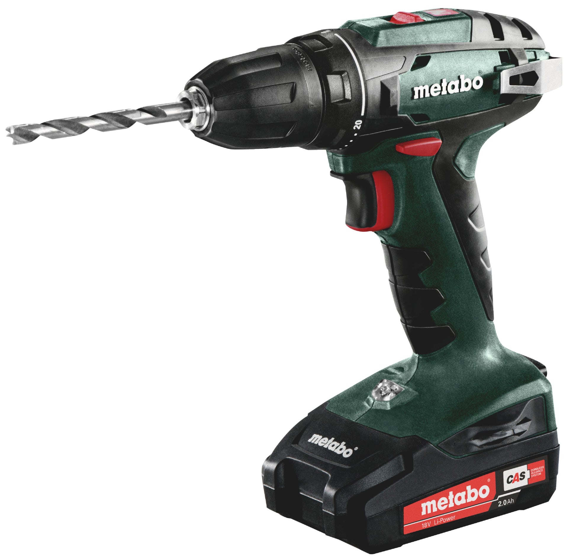 Schnellspannbohrfutter, Gürtelhaken, 2 Li-Power Akkupacks (18 V/2,0 Ah), Ladegerät SC 30, metaBOX 145