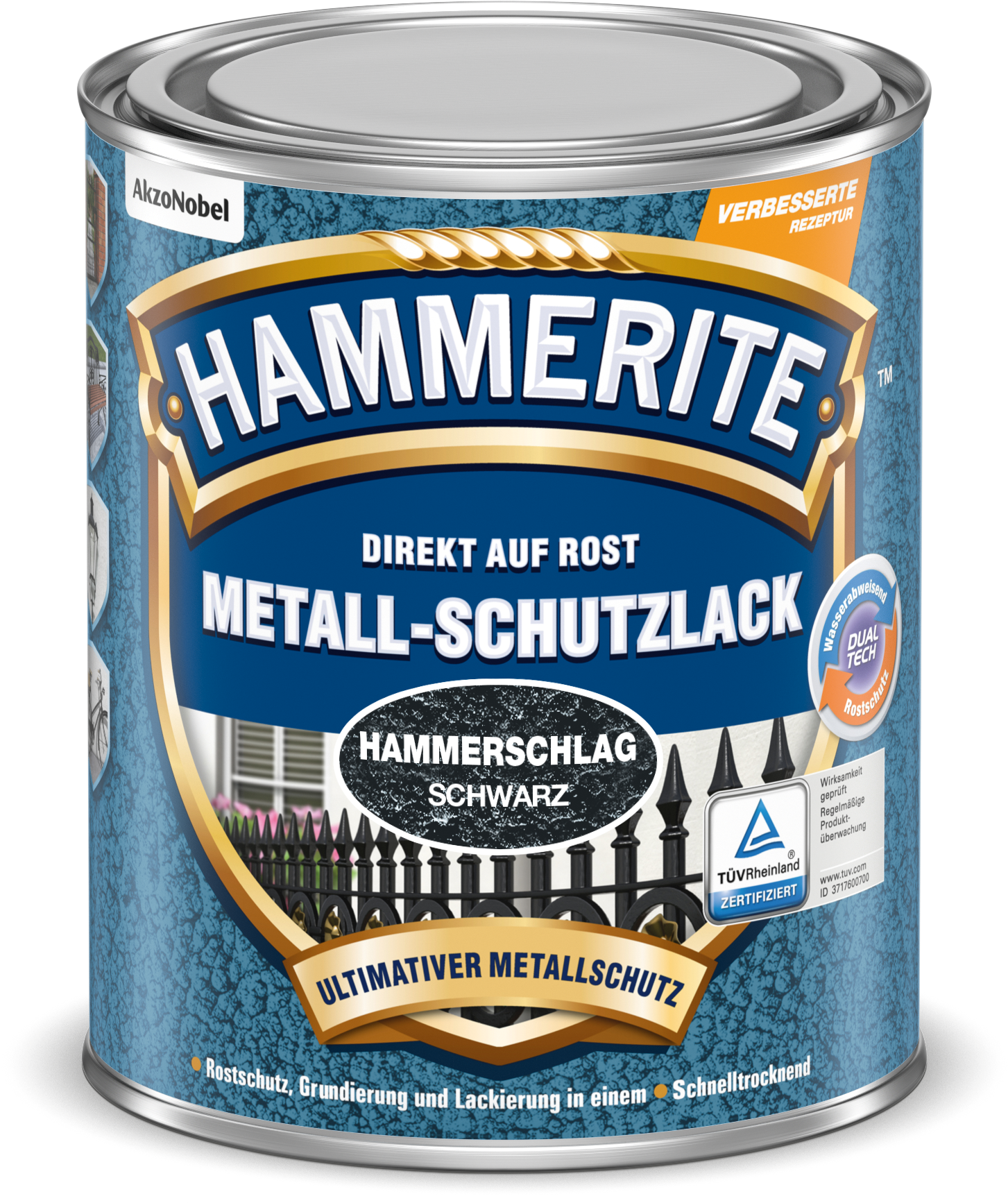 Eigenschaften: Direkt auf Rost, Rostschutz, Grundierung und Lack in einem, schnell trocknend, hohe Schlag- und Kratzfestigkeit, zuverlässiger Rostschutz, hochgradig witterungs- und UV-beständig, erzielt eine Hammerschlag-Optik.