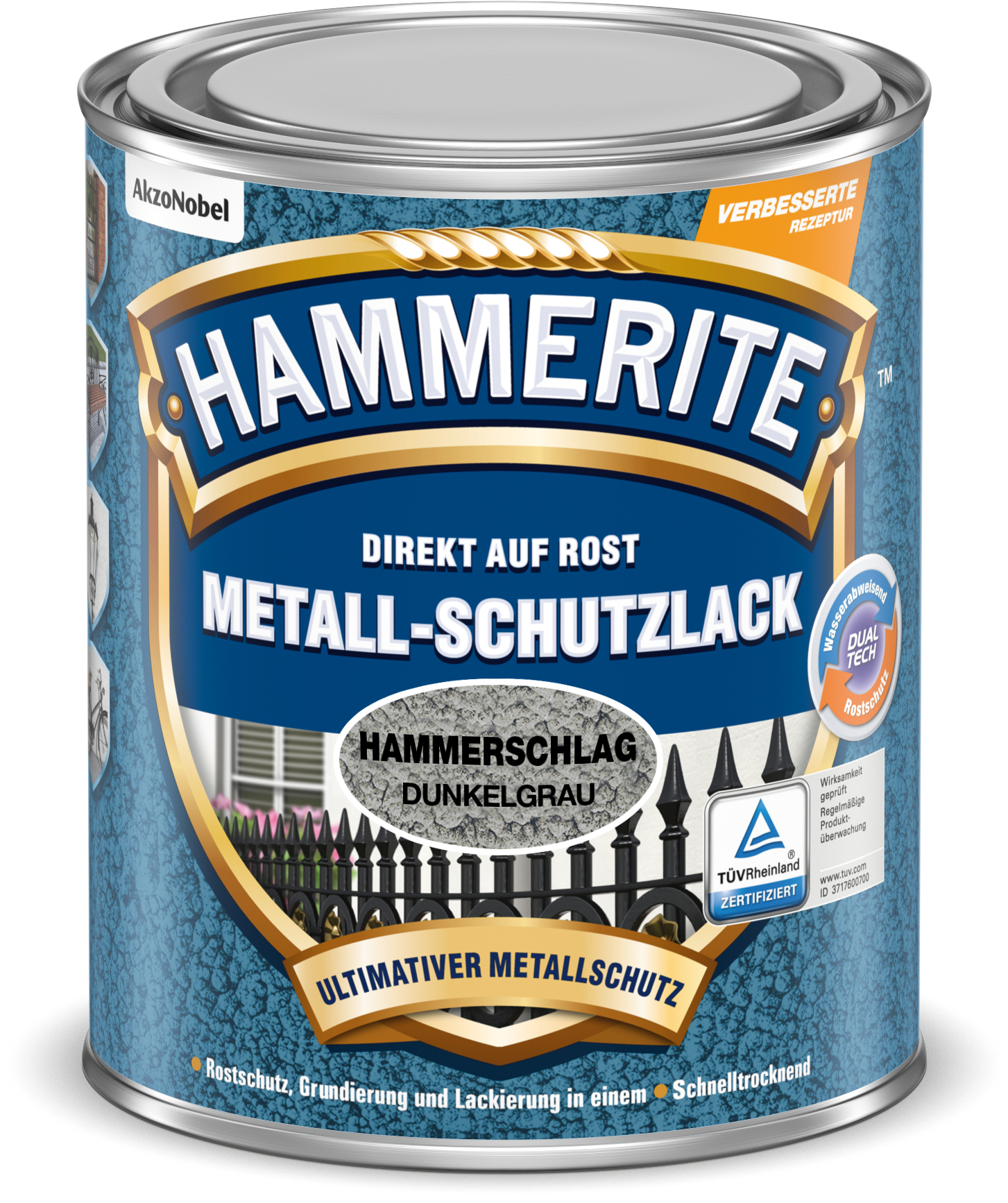 Besondere Eigenschaften: Direkt auf Rost, Rostschutz, Grundierung und Lack in einem, schnell trocknend, hohe Schlag- und Kratzfestigkeit, zuverlässiger Rostschutz, hochgradig witterungs- und UV-beständig, erzeugt eine Hammerschlag-Optik.