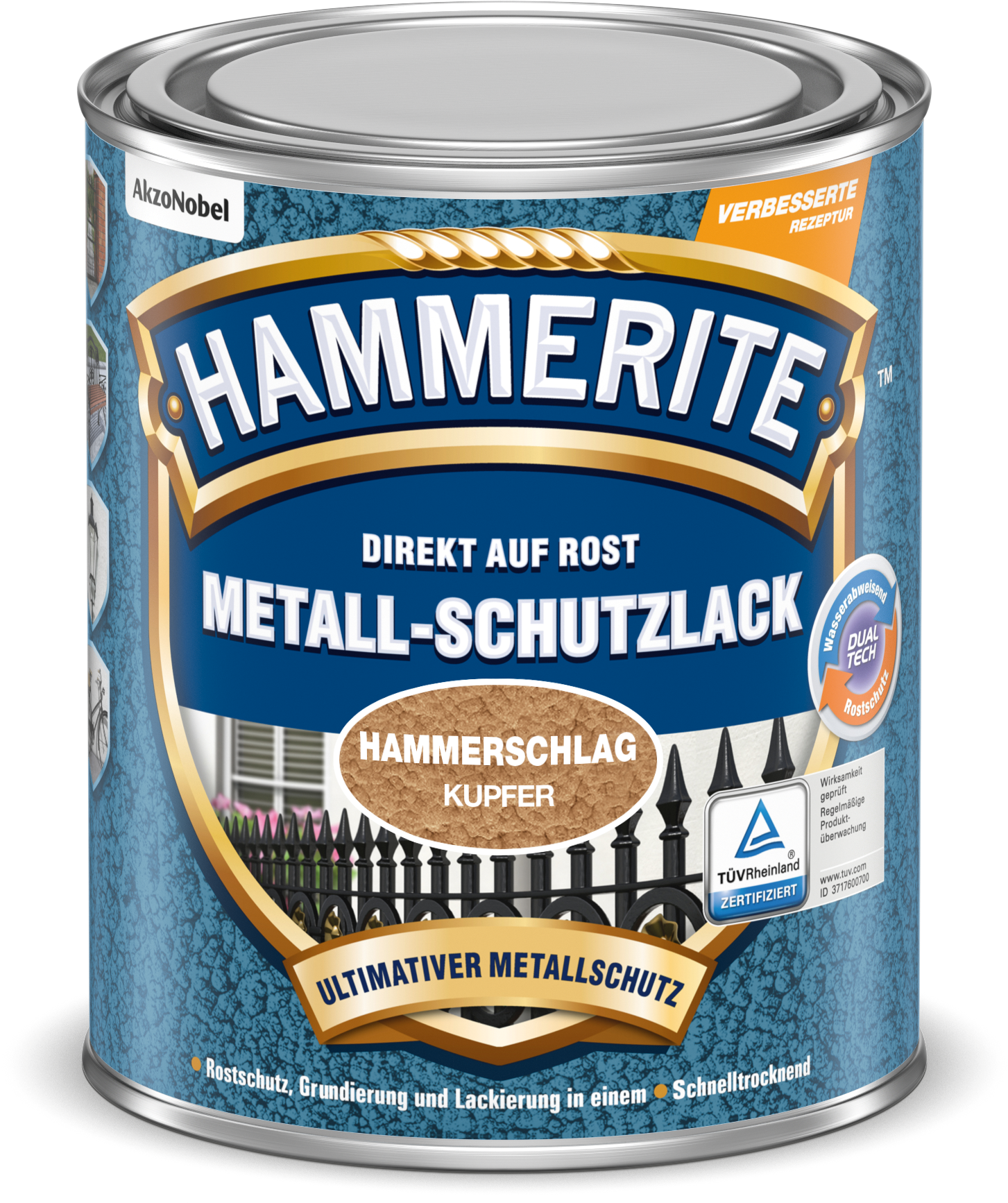Eigenschaften: Direkt auf Rost, Rostschutz, Grundierung und Lack in einem, schnell trocknend, hohe Schlag- und Kratzfestigkeit, zuverlässiger Rostschutz, hochgradig witterungs- und UV-beständig, erzielt eine Hammerschlag-Optik.