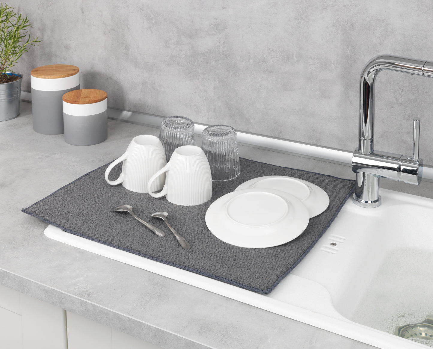 Upgrade für Ihre Küche: Mit der WENKO Mikrofaser Abtropfmatte Miko haben Sie die ideale Unterlage für gespülte Töpfe, Pfannen, Geschirr, Besteck und Gläser. Diese trocknen mit der cleveren Geschirrmatte ohne Kalkränder und Wasserflecken. Dabei wird die Arbeitsfläche bzw. Spülfläche geschont und immer trocken gehalten, da die Mikrofasern ein Mehrfaches des eigenen Gewichts absorbieren können. Legen Sie nach dem Abwasch einfach das nasse Geschirr auf Ihre neue Matte. Die saugfähige Mikrofaser nimmt das Wasser auf. So verhindern Sie Pfützen auf der Ablagefläche und Kalkränder an Gläsern. Das Spülgut trocknet schneller. Auch die Matte ist schnelltrocknend. Die praktische Geschirr-Abtropfmatte ist flexibel einsetzbar und faltbar. So ist eine platzsparende Aufbewahrung garantiert. Im trendigen Grau gehalten macht dieser schöne Küchenhelfer die Küche zu einem wahren Wohlfühlort. Im vielfältigen WENKO Sortiment gibt es zahlreiche passende Küchen-Utensilien, die Ihnen den Abwasch erleichtern.
