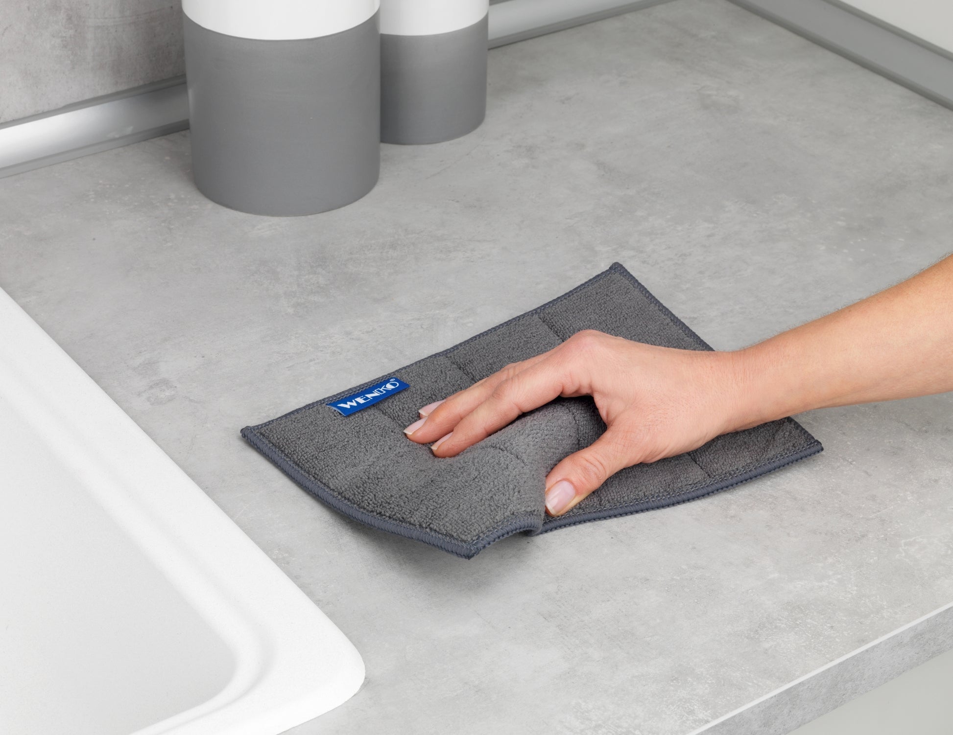 Upgrade für Ihre Küche: Mit dem WENKO Mikrofaser Reinigungsschwamm Miko haben Sie den idealen Haushalts-Schwamm für zu spülende Töpfe, Pfannen, Geschirr, Besteck und Gläser. Der hygienische Geschirrschwamm im praktischen 2er Set ist universell einsetzbar und entfernt professionell Fett, Essensreste, Fingerabdrücke, Verkrustungen etc. Mit seiner praktischen Größe sind die Schwämme auch ideal als Spül- und Reinigungstücher einsetzbar für alle anfallenden Reinigungsarbeiten im gesamten Haushalt. Die hochwertige Mikrofaser hat eine enorme Saugfähigkeit, denn sie kann ein Mehrfaches des eigenen Gewichts absorbieren. Der Clou: Zur Reinigung werden keine Reinigungsmittel benötigt – die Schwämme reinigen selbst hartnäckigen Schmutz mühelos nur mit Wasser. Das schont die Umwelt und den Geldbeutel. Das hochwertige Schwammtuch eignet sich ideal für empfindliche Oberflächen, denn es verfügt über eine feinere Seite für leichte Verschmutzungen. Die grobe Seite mit eingearbeiteten Bambusfasern reinigt zuverlässig bei hartnäckigem Schmutz. Auf diese Weise lassen sich Töpfe und beschichtete Pfannen sehr gut und leicht reinigen. Die hygienische Reinigung mit dem Haushalts-Schwamm funktioniert auch sanft bei Gläsern, der Herdoberfläche und empfindlichen Geschirr - und das ganz ohne Kratzer. Im trendigen Grau und Blau gehalten machen diese attraktiven Spülschwämme die Küche zu einem wahren Wohlfühlort. Im vielfältigen WENKO Sortiment gibt es zahlreiche passende Küchen-Utensilien, die Ihnen den Abwasch erleichtern. Besonders praktisch: Auch ein Putz-Schwamm verdient eine Reinigung. Bei Bedarf einfach bis 60 °C in der Waschmaschine mitwaschen.