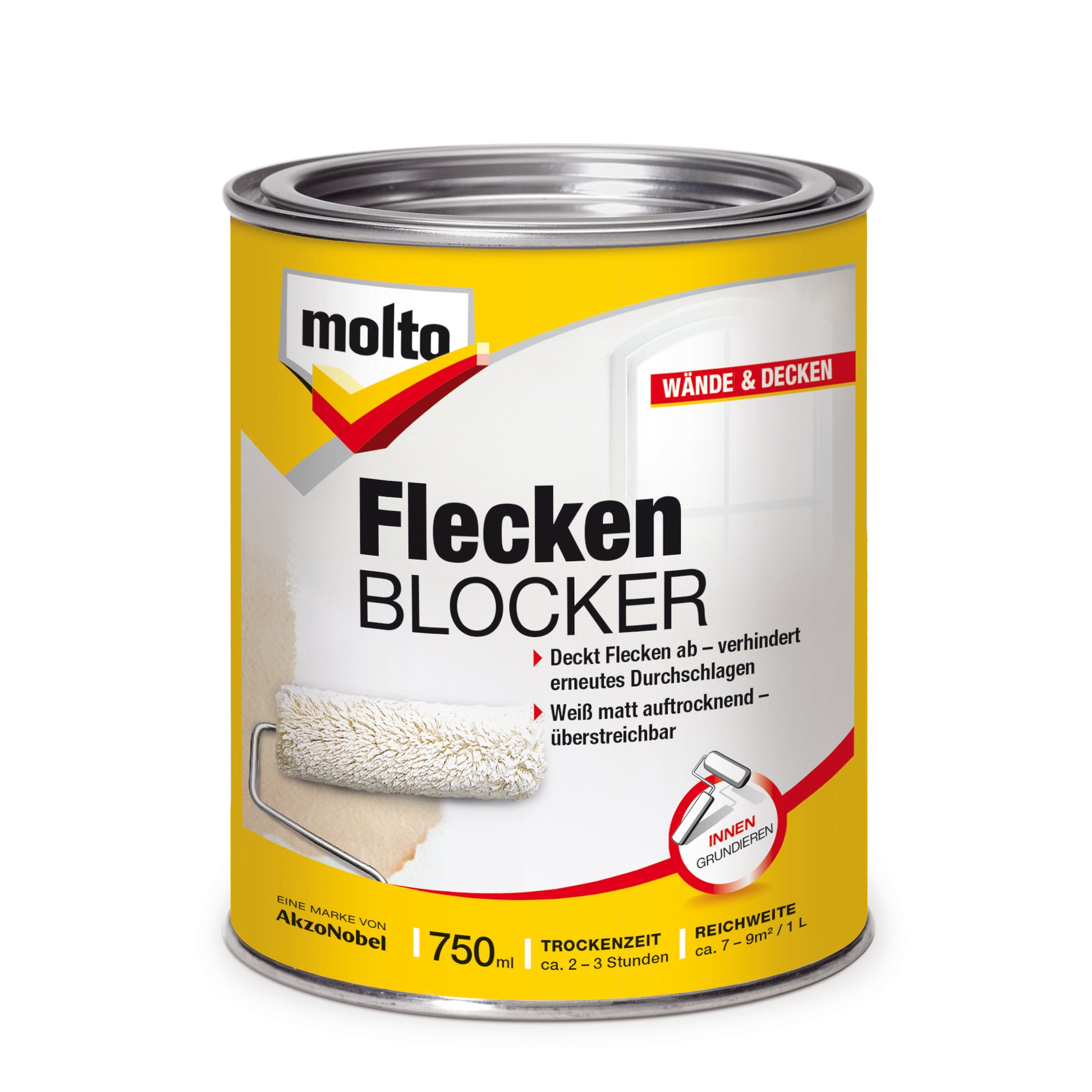 Molto Flecken Blocker ist ideal zum dauerhaften Abdecken von Flecken an Decken und Wänden: ob Wasser-, Nikotin-, Fett- oder Rostflecken, Rußverschmutzungen, Lippenstift-, Kugelschreiber-, Bleistift- und nahezu alle Filzstiftflecken. Molto Flecken Blocker, Deckt Flecken ab verhindert erneutes Durchschlagen, Weiß matt auftrocknend überstreichbar.