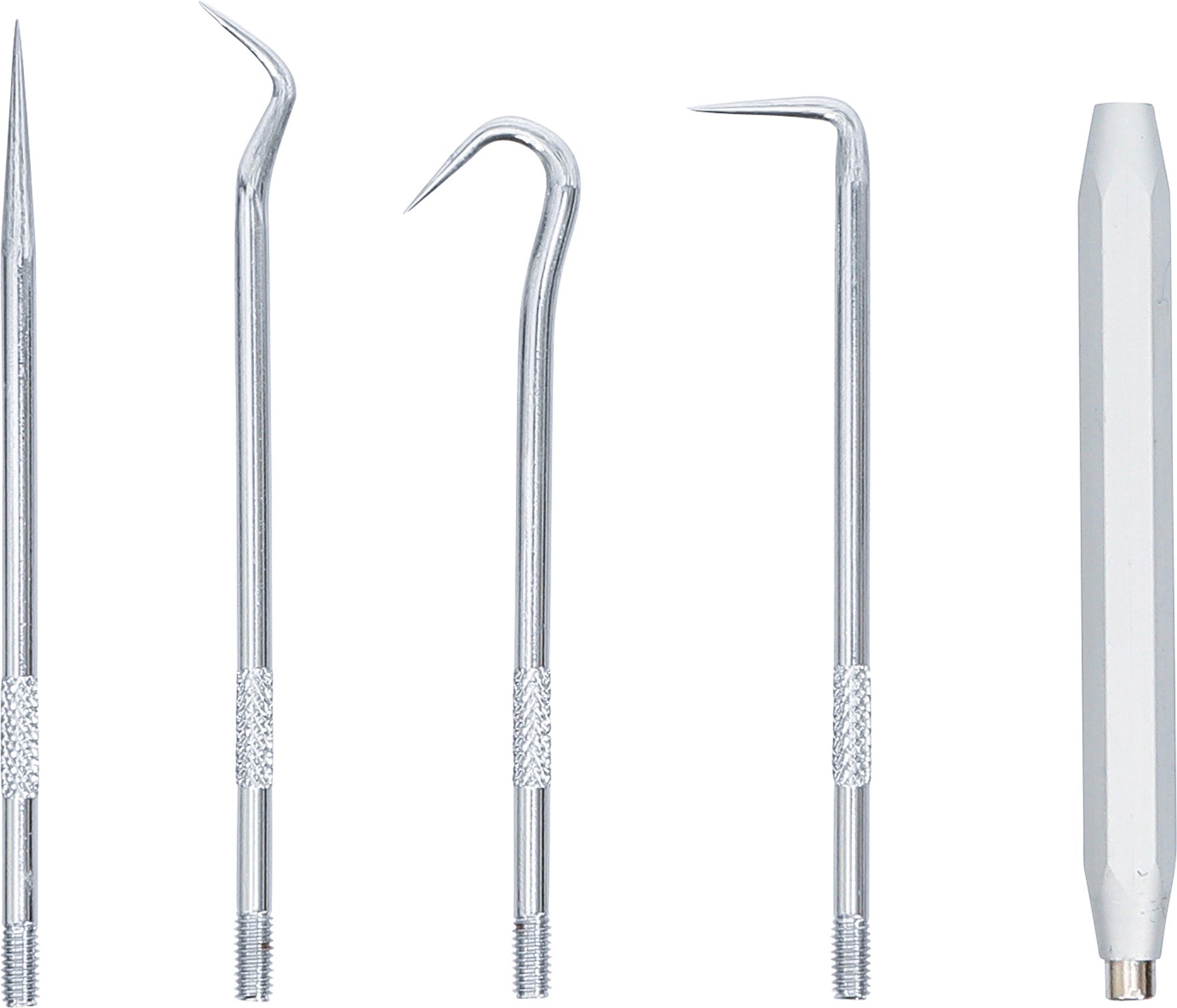 - Die weiteren Werkzeuge sind präzise geformte Haken und Spitzen, die ein gezieltes Greifen und Hebeln ermöglichen, ohne die Dichtungen zu beschädigen.