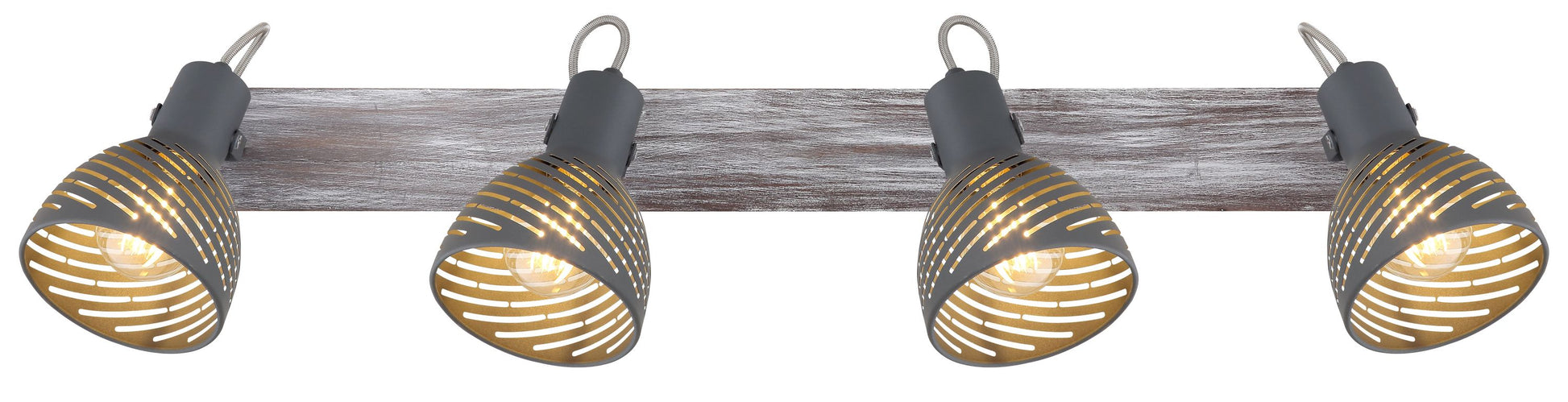 Dieser Deckenstrahler aus der Mori-Serie (80x12,5 cm) fügt sich wunderbar ins Ambiente verschiedenster Wohnstile. Er besteht aus einem weiß getünchten Holzbalken, der mit vier schwenkbaren, grauen Metallschirmen mit linienförmigen Stanzungen versehen ist. Diese können mit E27-Leuchtmitteln Ihrer Wahl bestückt werden, wodurch Sie die Möglichkeit haben, Lichtfarbe und Helligkeit individuell zu bestimmen. Durch weitere Modelle der gleichen Serie können Sie das Gesamtbild in Ihren vier Wänden komplettieren.