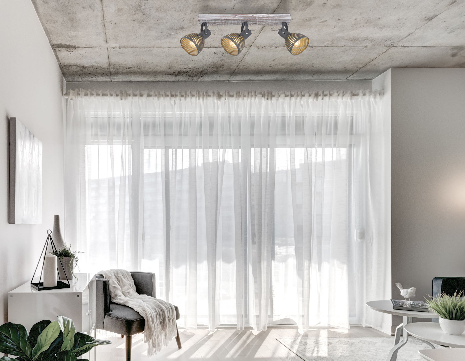 Dieser Deckenstrahler aus der Mori-Serie (54x12,5 cm) fügt sich wunderbar ins Ambiente verschiedenster Wohnstile. Er besteht aus einem weiß getünchten Holzbalken, der mit drei schwenkbaren, grauen Metallschirmen mit linienförmigen Stanzungen versehen ist. Diese können mit E27-Leuchtmitteln Ihrer Wahl bestückt werden, wodurch Sie die Möglichkeit haben, Lichtfarbe und Helligkeit individuell zu bestimmen. Durch weitere Modelle der gleichen Serie können Sie das Gesamtbild in Ihren vier Wänden komplettieren.