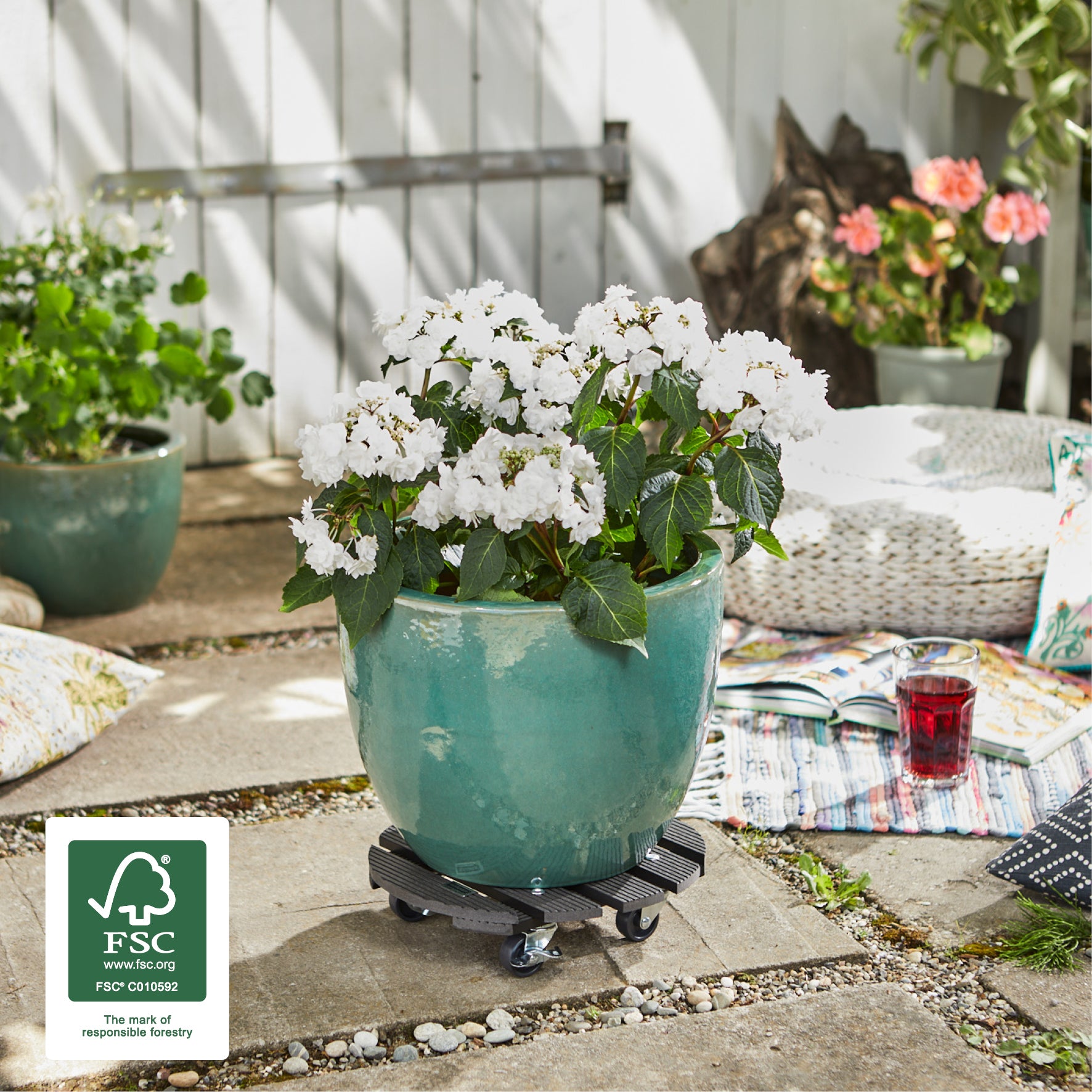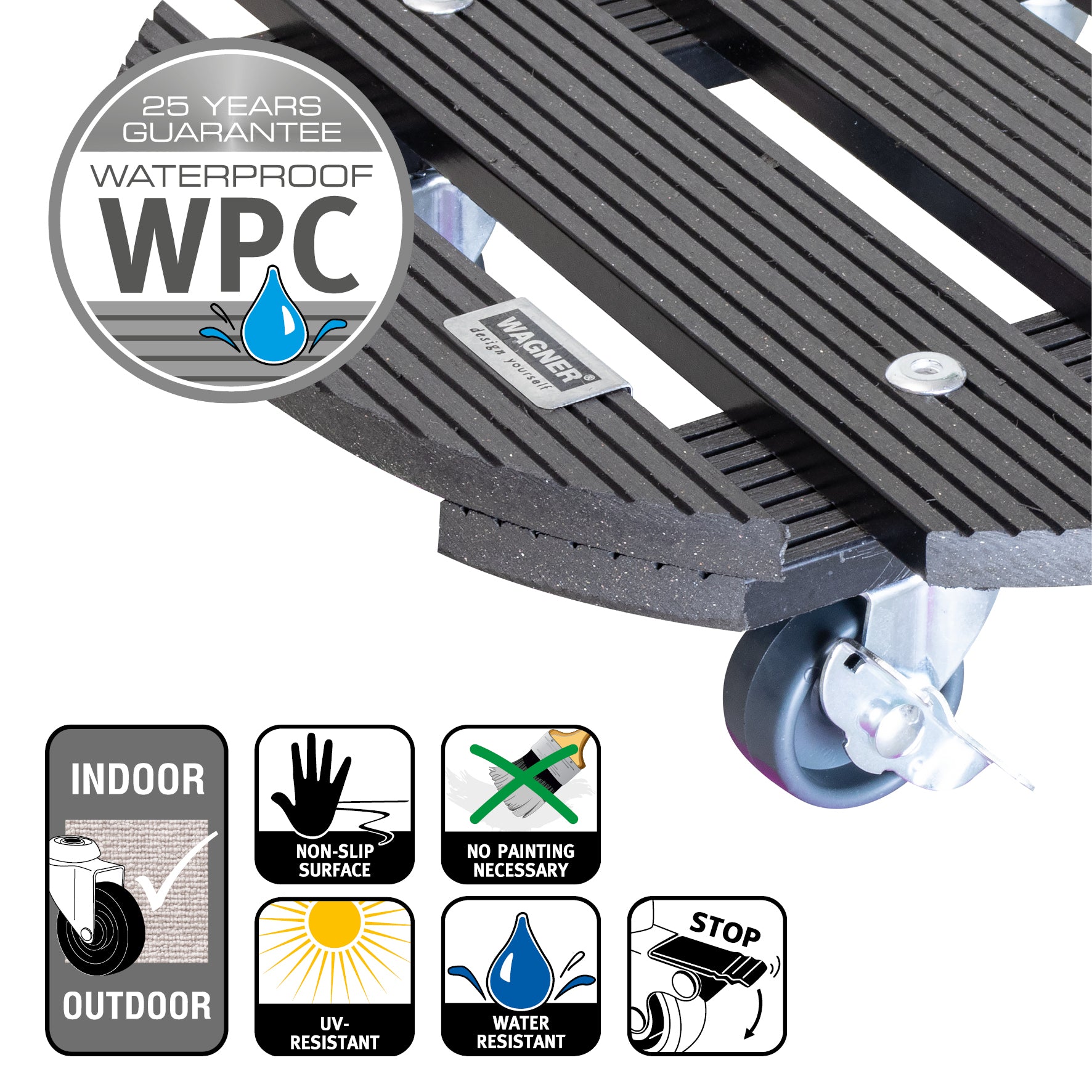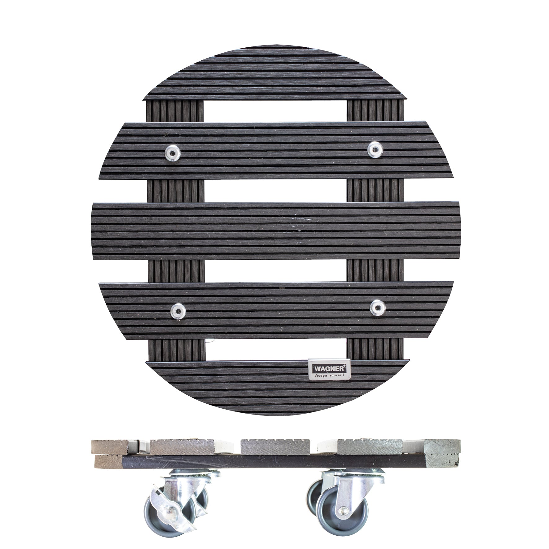 WAGNER Pflanzenroller WPC Ø 29 x 7,5 cm I Blumenroller für Außenbereich + Innenbereich I Kübelroller FSC® Wood Plastic Composite, anthrazit I 2 Feststeller I Tragkraft 100 kg
