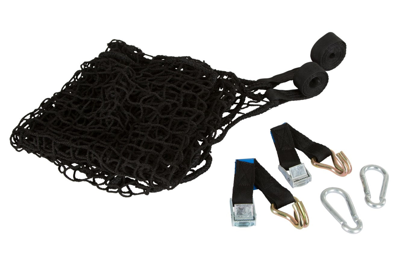 Die Lieferung beinhaltet außerdem 2 praktische Karabinerhaken sowie 2 robuste Gurte. Ein Gurtende wird mithilfe von Klemmschlössern sicher an den PES-Zugbändern des Netzes befestigt, während das andere Gurtende mit stabilen Spitzhaken an den Ankerpunkten Ihres Fahrzeugs fixiert wird. So ist eine vielseitige und sichere Anbringung gewährleistet.