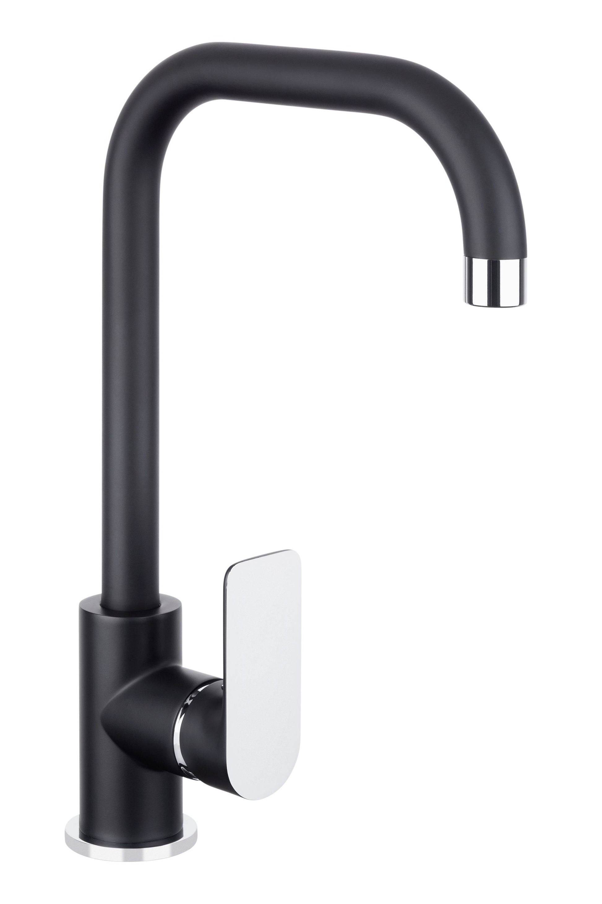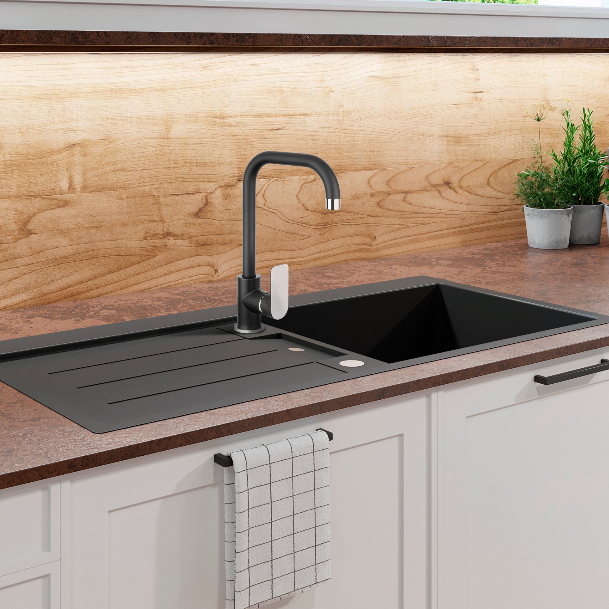 Hergestellt aus Druckguss und Messinggemäß aktueller DIN" Flexible Anschlussschläuche, Länge: 500 mm,geprüft nach aktueller Trinkwassernorm KTW-A" Leicht auswechselbare, KTW geprüfte Kartuschemit langlebigen Keramikdichtscheiben" Mit hohem schwenkbarem Auslauf" Geräuschklassen geprüfter Luftsprudler M22x1 - Made in Germany" Mit Schaftbefestigung zur leichten, werkzeuglosen Montage" Inkl. Montagezubehör" Farbe: Schwarz/Chrom