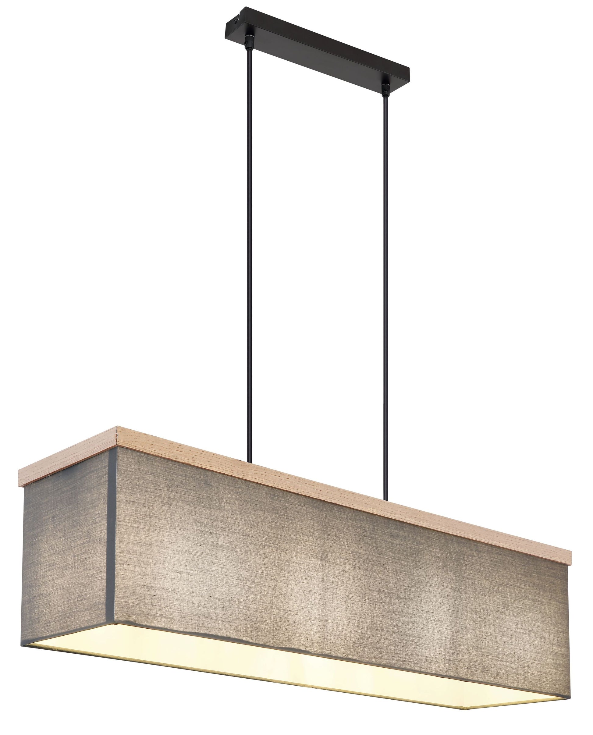 Diese wunderschöne Hängeleuchte begeistert durch tolles Design. Aus einer schmalen schwarzen Deckenbefestigung ragen zwei schwarz matte Metallstangen bis zu einer Länge von 1,2m zu einem rechteckigen Textilschirm in der Farbe Anthrazit. (80x20cm). Dieser ist mit zwei E27 LED Fassungen ausgestattet und ermöglicht Ihnen, bis zu einer maximalen Leistung von 9W, selbst über Lichtfarbe und Helligkeit zu bestimmen. Durch weitere Modelle dieser Serie können Sie Ihren Wohnbereich perfekt ergänzen. Aufgrund von Langlebigkeit und Stromersparnis empfehlen wir LED Leuchtmittel.