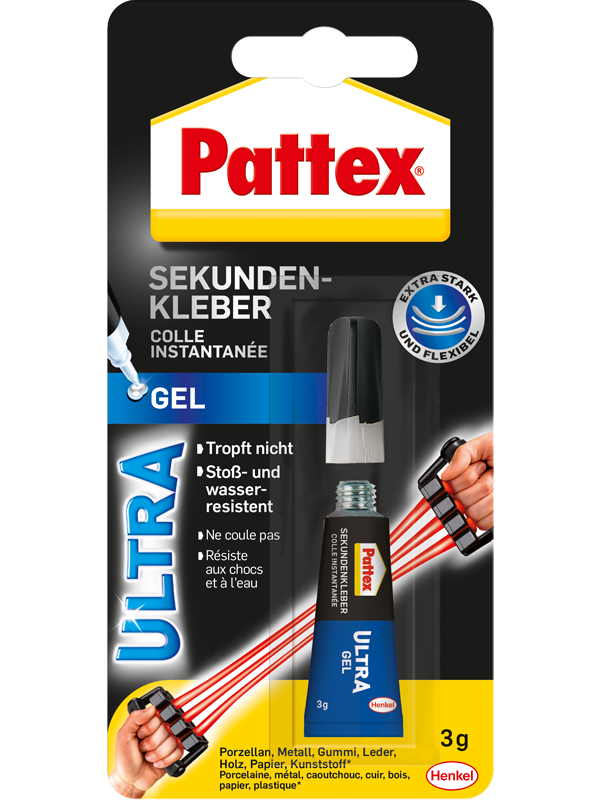 Suchst du einen Sekundenkleber, der nicht nur extra stark ist, sondern auch flexibel, stoß- und wasserresistent und dabei nicht tropft? Der Pattex Sekundenkleber Ultra Gel (3g) ist deine ideale Wahl! Mit seiner Henkel Rezeptur mit Mikro-Gummipartikeln liefert dieser gelförmige Kleber bruchsichere Verklebungen auf einer Vielzahl von Materialien, selbst unter Beanspruchung.