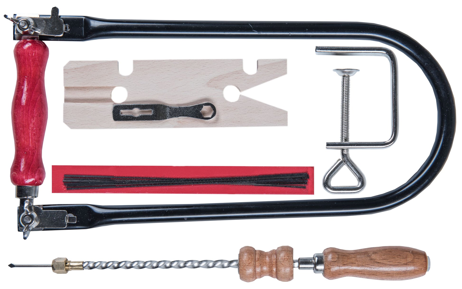 Bestehend aus: 1 Laubsägebogen, 6 Ersatz-Sägeblätter, 1 Laubsägebrettchen aus Holz mit Einspannhalterung für das Laubsägeblatt, 1 Laubsägezwinge, 1 Drillbohrer und 1 Laubsägeschlüssel