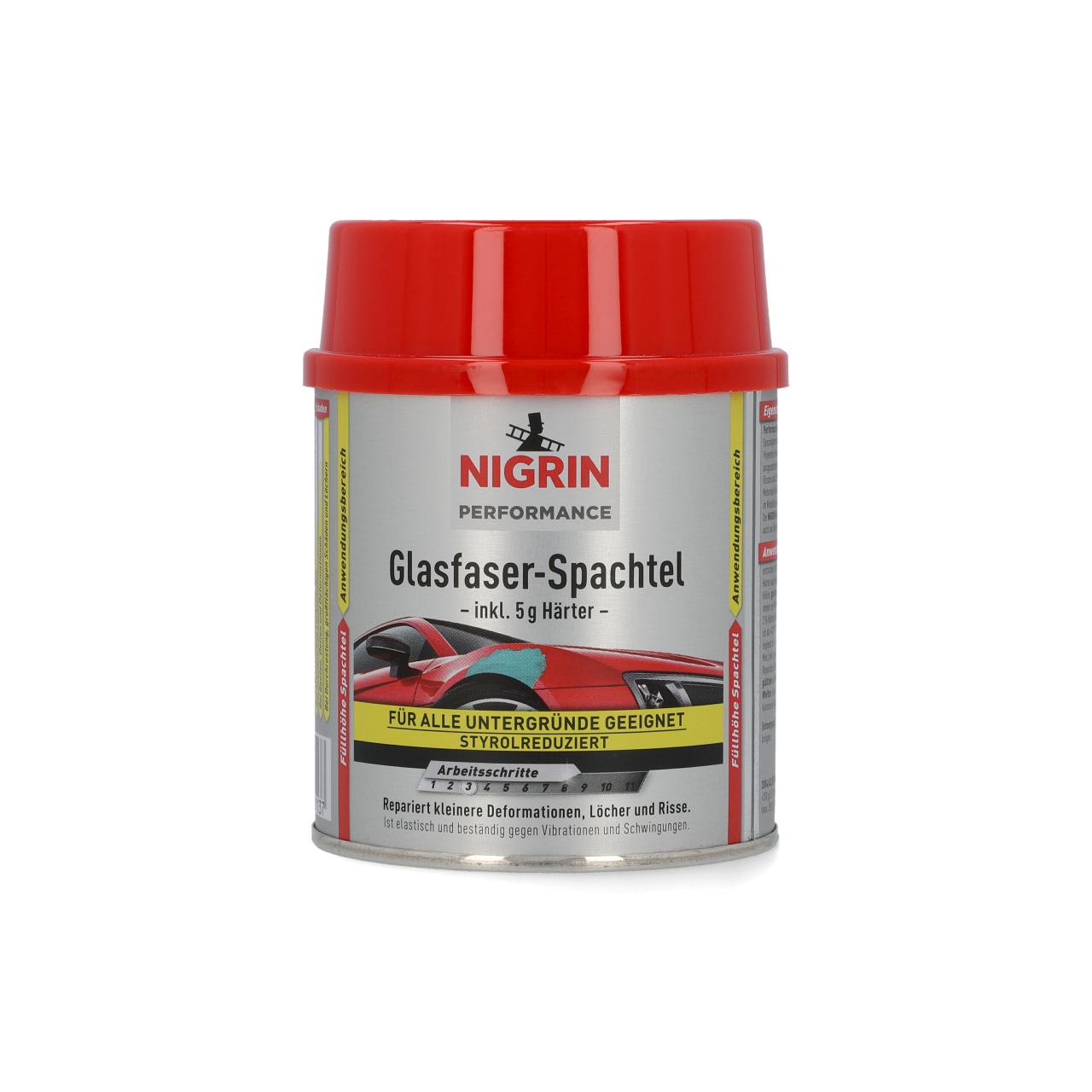 NIGRIN Performance Glasfaser-Spachtel ist ein Spezialgemisch aus hochwertigen, elastischen Polyester-Harzen und Glasfasern. Er eignet sich ausgezeichnet für die Reparatur von Deformationen, Rissen und Löchern an Fahrzeug-Karosserien, Motorrad-Verkleidungen, Wohnwagen, Booten oder im Modellbau und bietet optimale Haftfestigkeit. Der Glasfaser-Spachtel ist auch zur Verstärkung angerosteter Bleche geeignet. STYROLREDUZIERT Spachtelfarbe grün