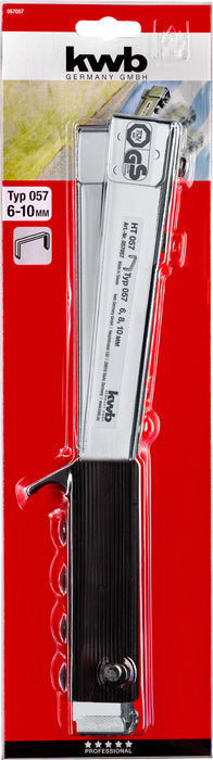 Der kwb PROFI Hammertacker HT 057 verfügt über einen Handgriff mit Fingerschutz. Das Magazin fasst bis zu 160 Heftklammern vom Typ 057 bis zu 10 mm.