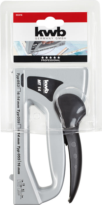 Der kwb BLUE TACK MT 14 N für den professionellen Dauereinsatz mit stufenloser Schlagkraftregulierung und softem Handgriff besteht aus schwerem Metall. Der Tacker ist für Heftklammern vom Typ 053 bis 14 mm Länge sowie Stifte und Nägel Typ 055 bis 16 mm Länge geeignet.
