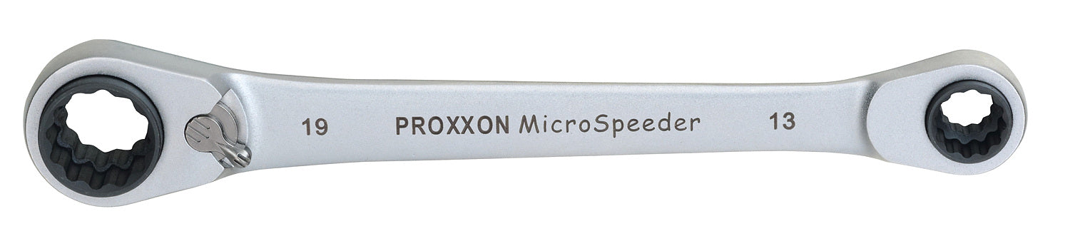 Nur ein Werkzeug für die vier wichtigsten PKW-Schrauben dank des 4fach-MicroSpeeders 10-13 / 17-19 mm von PROXXON. Für zeitsparendes Arbeiten ohne Umsetzen. Ratschenfunktion mit 72-zahnigem Innenring aus hochlegiertem Spezialstahl. Der Antrieb erfolgt bereits bei einer Hebelbewegung von 5°. Hebelumschaltung für Rechts- und Linkslauf. Schaft aus CrV-Stahl mit optimalem Oberflächenschutz: 2 x vernickelt, 1 x mattverchromt. Mit Laserbeschriftung und deutlich lesbaren Schlüsselweiten. Hinweis: Der 4fach-MicroSpeeder ist im Vergleich zum Einsatz von zwei MicroSpeedern mit Doppelring 10 x 13 und 17 x 19 zwar etwas klobiger. Man kann bei Größe 13 und 19 auch nicht durchstecken. Aber dafür hat man nur ein Werkzeug in der Tasche. Gewerblich voll nutzbar!