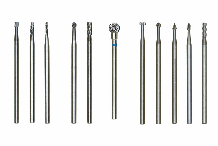 Der PROXXON Feinfräsersatz aus ausgewählter Wolfram-Vanadium-Stahlqualität. Zweckmäßige, stabile Konstruktion. Schaft und Frästeil aus einem Stück gefertigt. Präzise geschliffene Verzahnung und präzise Rundlaufgenauigkeit bei gleichzeitiger Elastizität. Zum Bearbeiten von Weich- und Hartholz, NE-Metallen, Edelmetallen sowie Kunststoff und Gips. Optimal zum Ausarbeiten, Formen, Profilieren und Nuten. Optimale Schnittgeschwindigkeiten sind vom Durchmesser des jeweiligen Fräsers und des zu bearbeitenden Material abhängig. Je größer der Fräser, um so niedriger muss die Drehzahl sein. Für das zu bearbeitende Material gilt: Weiches Material = hohe Drehzahl, hartes Material = niedrige Drehzahl. Die Ausnahme bildet Kunststoff. Zum sauberen und kraftvollen Spannen der Fräser empfehlen wir den Einsatz von MICROMOT-Stahlspannzangen.