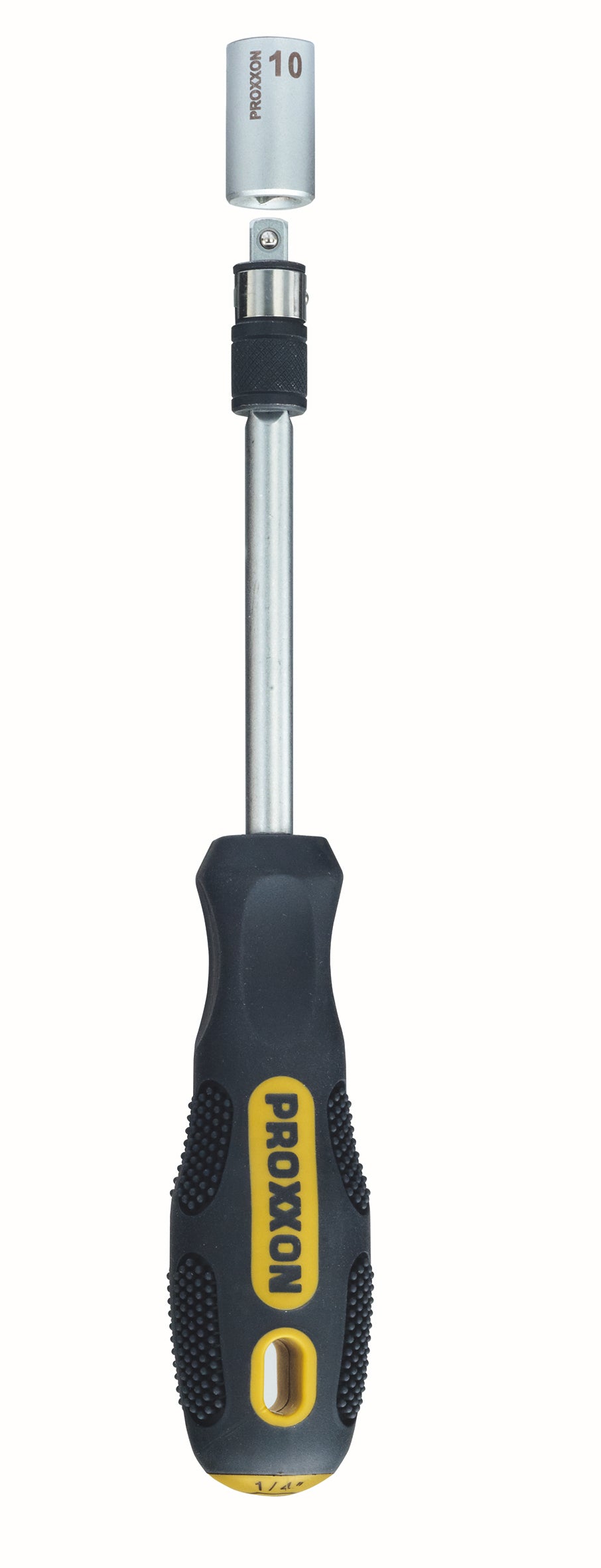 FLEX-DOT Kombi-Schraubendreher von PROXXON: Zwei-Komponenten-Griffform mit flexiblen Noppen für ermüdungs- und schmerzfreies Arbeiten: Gute Griffigkeit bei schnellem Umgreifen. Hohe Drehmomente und Andruckkräfte durch ausbalanciertes Design für horizontalen und vertikalen Ansatz. Für 1/4''-Standard-Bits und 1/4''-Steckschlüsseleinsätze (6,3 mm). Der Wechsel der Aufnahme erfolgt durch einfaches Verschieben der Aufnahmehülse.