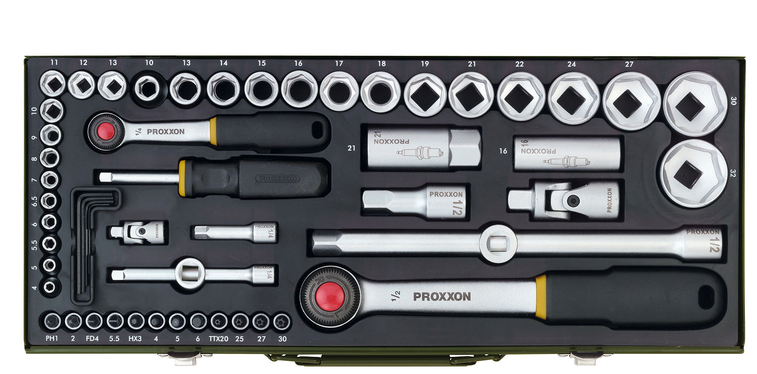 Der Komplett-Steckschlüsselsatz 1/4'' + 1/2'' von PROXXON kommt im stabilen, pulverbeschichteten Stahlkasten. Mit Steckschlüsseleinsätzen von 4 - 32 mm und Zündkerzenspezialeinsätzen von 16 und 21 mm. Schraubereinsätze mit Vierkantantrieb für Schlitzschrauben, Kreuzschlitzschrauben, TX-Schrauben (mit stirnseitiger Bohrung) und Innensechskantschrauben sowie Innensechskantschlüssel (abgewinkelt) Größe 1,25 - 1,5 - 2 - 2,5 und 3 mm sind ebenfalls enthalten. Eine Tabelle für Gewinde von M 1,6 - M 24 mit Anzugsdrehmomenten ist im Deckel dauerhaft fixiert. Werte für Härte und maximales Drehmoment sind besser als von DIN/ISO gefordert. Die Maßhaltigkeit liegt innerhalb der zugelassenen Toleranzen. Mit verwindungsfesten, unverwüstlichen Formeinlagen aus gespritztem POLYPROPYLEN. Ölfest, säurefest, und leicht zu reinigen. Mit dauerhaft gut lesbarer Markierung für alle Schlüsselweiten. Sie eignen sich ebenfalls hervorragend zum Einlegen in Schubladen der gängigen Werkstattwagen.