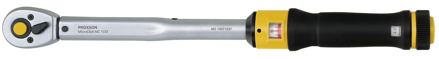 Der Drehmomentschlüssel MicroClick MC 100 von PROXXON ist ein Präzisionswerkzeug mit hoher Genauigkeit (Toleranz nach ISO 6789 +/- 3%). Mit 3/8''-Vierkantantrieb (10 mm). Mit Ratschenmechanismus und Umschaltung von Rechts- auf Linksgang. Automatische Kurzauslösung: Deutlich hör- und spürbares Click-Signal beim Erreichen des vorgewählten Drehmomentes. Aufsatz sitzt fest und löst sich auf Knopfdruck von selbst durch praktischen Entriegelungsmechanismus. Stabiler, ovaler Schaft aus Stahl. Mit optimalem Rostschutz: 2x vernickelt, anschließend mattverchromt. Stück für Stück kalibriert und endgeprüft. Mit dauerhaft gelaserter Seriennummer zur Identifikation. Deutlich lesbare Analoganzeige für das vorgewählte Drehmoment. Ergonomischer Griff, den man durch seine Formgebung automatisch mittig greift. Wichtig für exaktes Auslösen. Zusätzliche Mikro-Skala zum Feinjustieren. Simples Vorwählen des Drehmomentes durch Drehen des gerändelten Ringes. Die Position wird dann durch Einschubring fixiert.