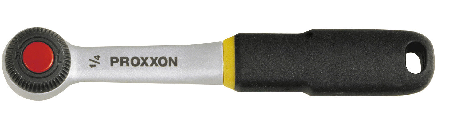 Die Standardratsche 1/4'' von PROXXON. Die vielfach Bewährte! Mit Umschaltfunktion direkt auf dem Ratschenmechanismus. Mehrere der 52 Zähne rasten gleichzeitig ein und übertragen extrem hohe Drehmomente. Entriegelungs-Mechanismus: Lösen der Einsätze durch Knopfdruck. Kopf und Schaft aus einem Stück CrV-Stahl geschmiedet, 2x vernickelt und matt-verchromt. Griff aus öl- und säurefestem TPR (Thermoplastic Rubber) mit praktischer Bohrung zum Aufhängen.