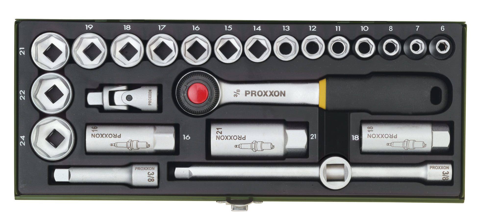 Der Steckschlüsselsatz 3/8'' von PROXXON kommt im stabilen, pulverbeschichteten Stahlkasten. Mit Steckschlüsseleinsätzen von 6 bis 24 mm, Zündkerzenspezialeinsätzen von 16, 18 und 21 mm sowie weiterem hochwertigem Zubehör. Eine Tabelle für Gewinde von M 1,6 - M 24 mit Anzugsdrehmomenten ist im Deckel dauerhaft fixiert. Werte für Härte und maximales Drehmoment sind besser als von DIN/ISO gefordert. Die Maßhaltigkeit liegt innerhalb der zugelassenen Toleranzen. Mit verwindungsfesten, unverwüstlichen Formeinlagen aus gespritztem POLYPROPYLEN. Ölfest, säurefest, und leicht zu reinigen. Mit dauerhaft gut lesbarer Markierung für alle Schlüsselweiten. Sie eignen sich ebenfalls hervorragend zum Einlegen in Schubladen der gängigen Werkstattwagen.