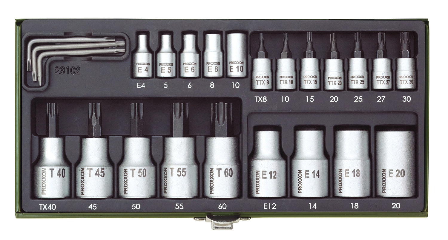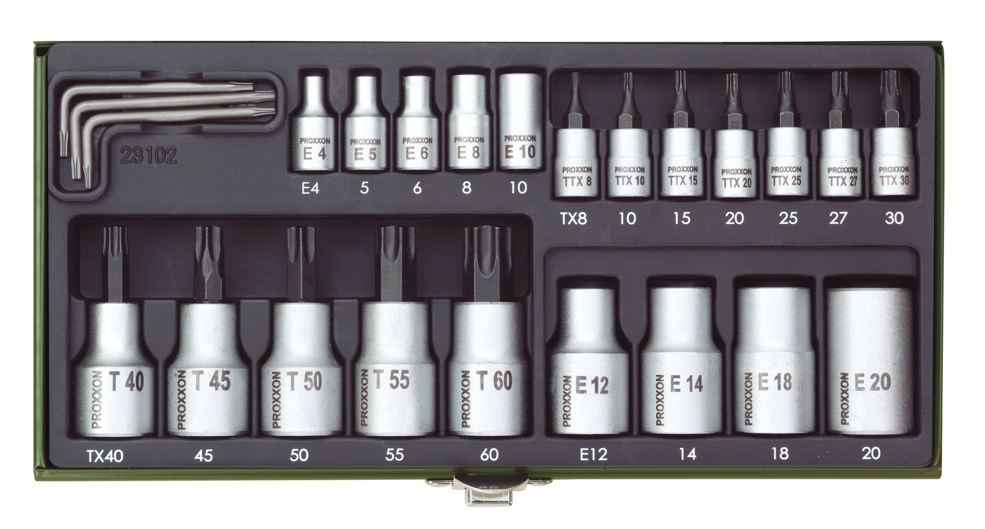 Der Steckschlüsselsatz ''TX'' von PROXXON kommt im stabilen, pulverbeschichteten Stahlkasten. Er bietet Schraubereinsätze für 1/4''- und 1/2''-Antrieb. Schraubereinsätze für 1/4''-Antrieb von Gr. TX 8 bis TX 30 (mit stirnseitiger Bohrung) und AußenTX Gr. E4 bis E10 (alles Anzugsdrehmomente bis 25 Nm) Für 1/2''-Antrieb Schraubereinsätze von Gr. TX 40 bis TX 60 und AußenTX E 12 bis E 20 (für Anzugsdrehmomente von 25 bis 135 Nm) Des Weiteren drei abgewinkelte Schlüssel TX 6, 8 und 10 enthalten. Mit verwindungsfesten, unverwüstlichen Formeinlagen aus gespritztem POLYPROPYLEN. Ölfest, säurefest, und leicht zu reinigen. Mit dauerhaft gut lesbarer Markierung für alle Schlüsselweiten. Sie eignen sich ebenfalls hervorragend zum Einlegen in Schubladen der gängigen Werkstattwagen.