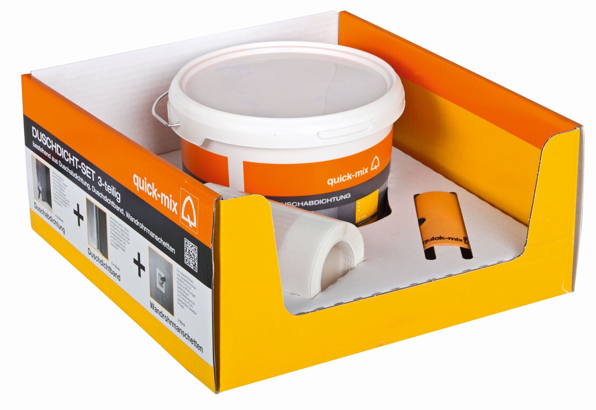 quick-mix Duschdicht-Set besteht aus 3 Einzelkomponenten (gebrauchsfertige Duschabdichtung, gewebearmiertes Duschdichtband, 2 Wandrohrmanschetten), mit welchen Sie Ihre Dusche optimal zur wasserzugekehrten Seite abdichten.
