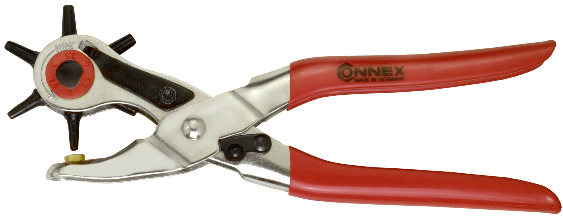 Aus Stahlblech gepresst" Mit 6 Pfeifen: 2 - 2,5 - 3 - 3,5 - 4 - 4,5 mm Ø zum Lochen von Leder, Pappe etc." Griffe Kunststoff tauchbeschichtet