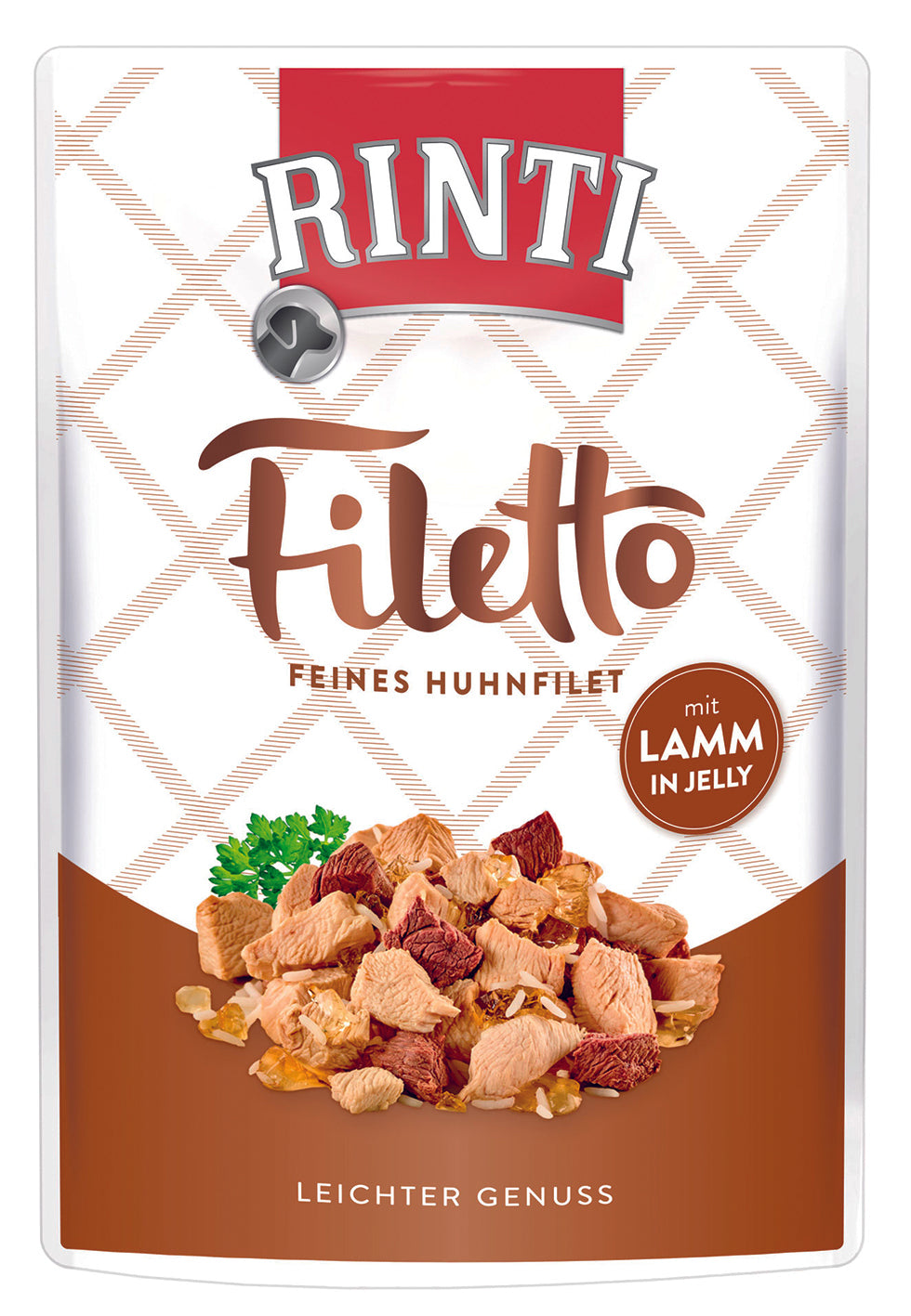 Helle Filetstückchen vom Huhn in delikater Jelly, garniert mit feinen Stückchen vom Lamm, zubereitetim Rinti-Schonverfahren. Diese Fleischmahlzeit ist nicht nur leicht verdaulich, sie bietet dem Hund auch ein besonderes Geschmackserlebnis.