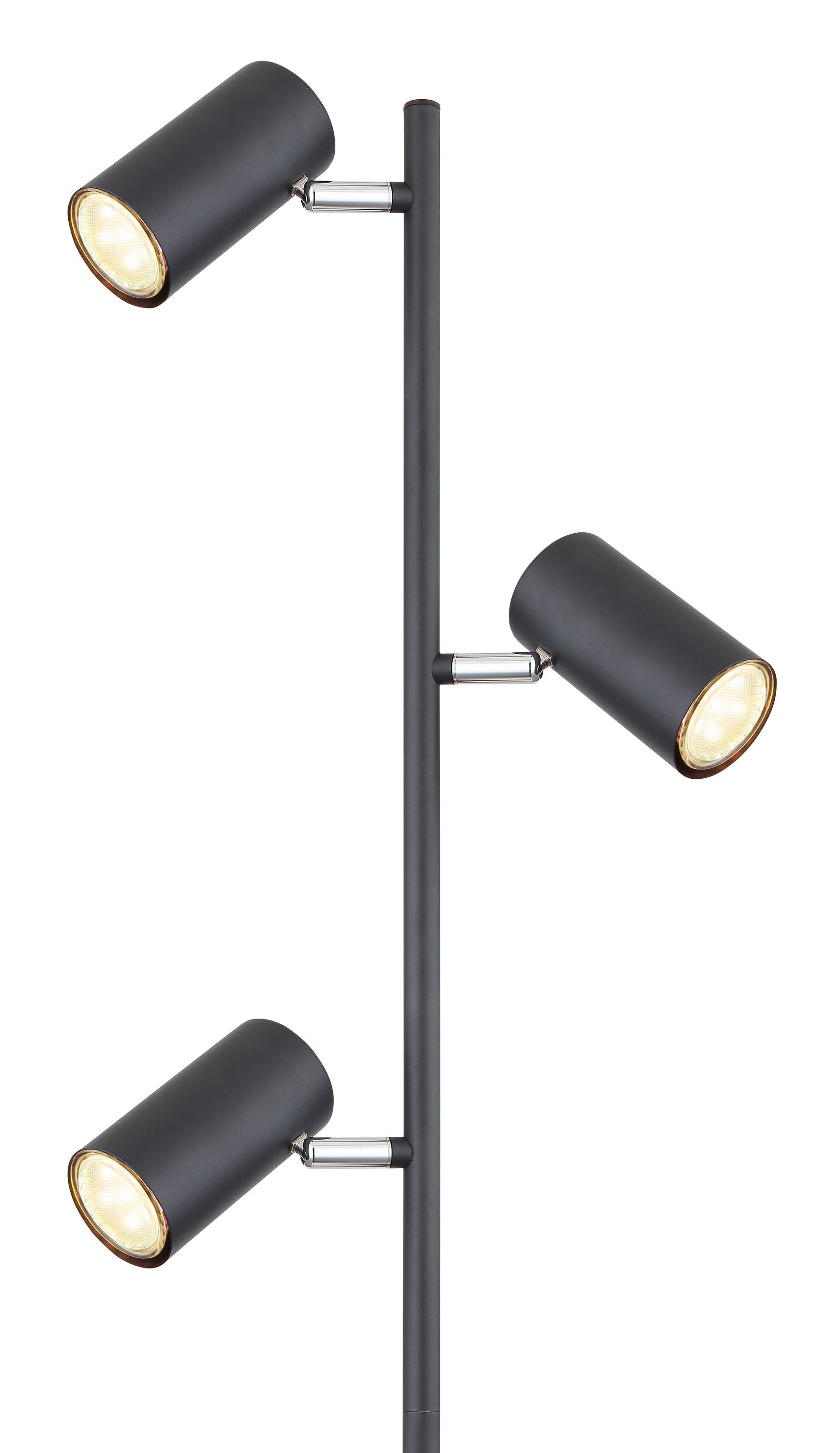Diese 154 cm große Stehlampe aus der Robby-Serie ist eine wunderbare Ergänzung für Ihre Innenräume. Die aus schwarz-mattem Metall gefertigte Stehleuchte besteht aus einem runden Metallsockel, an dem ein Stab mit drei schwenkbaren, von Metall ummantelten GU10-Fassungen fixiert ist. Diese können mit LED-Leuchtmitteln Ihrer Wahl bestückt werden, wodurch Sie die Möglichkeit haben, Lichtfarbe und Helligkeit individuell zu bestimmen. Außerdem verfügt sie über einen inkludierten Schalter, mit dem die Leuchte bequem ein- und ausgeschaltet werden kann. Durch weitere Modelle der gleichen Serie können Sie das Gesamtbild in Ihren vier Wänden komplettieren.